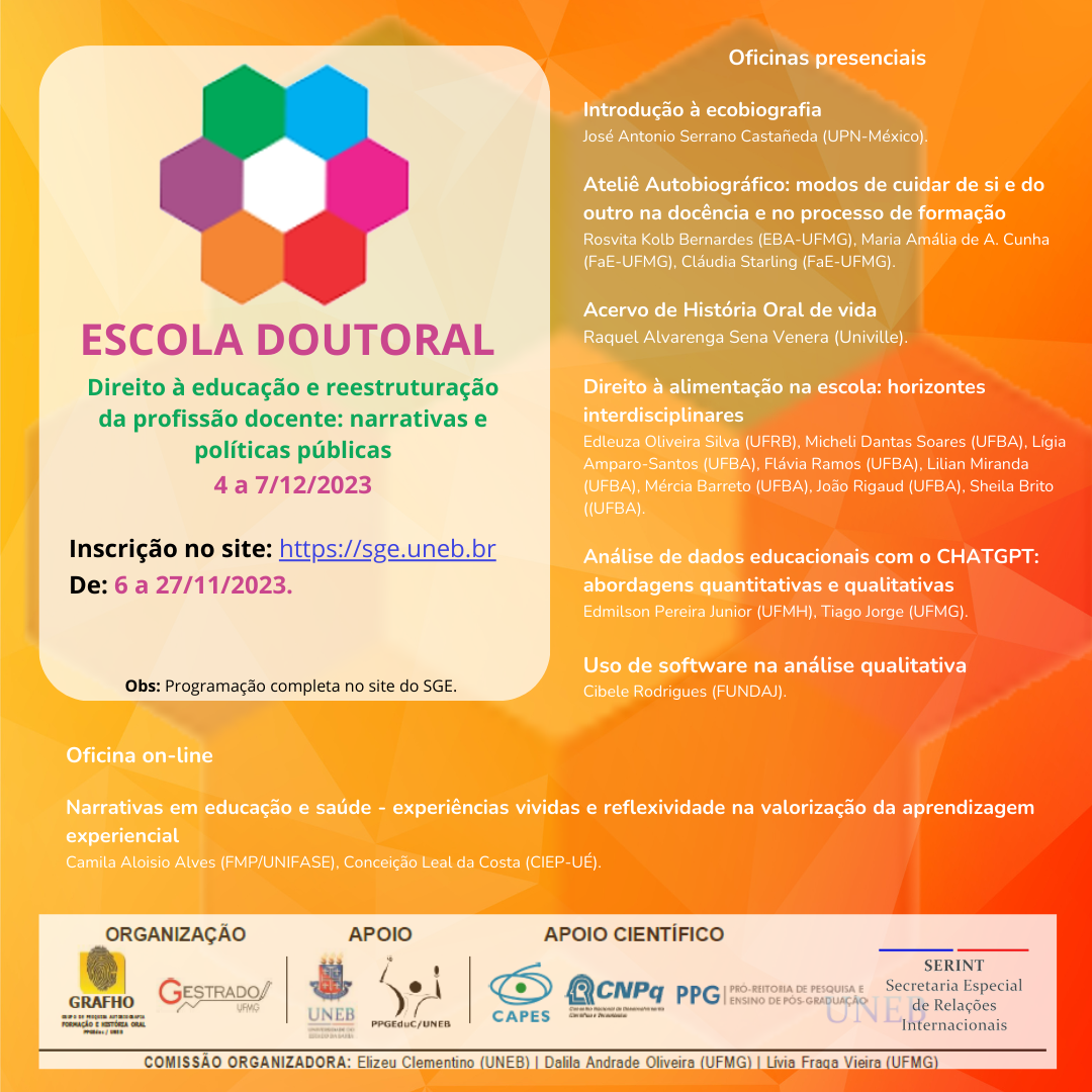 A Escola Doutoral será realizada no âmbito do Programa de Pós-graduação em Educação e Contemporaneidade (PPGEduC/UNEB) e do Programa de Pós-graduação em Educação: conhecimento e inclusão social (PPGE/UFMG) como ação prevista nos planos de trabalho das seguintes pesquisas desenvolvidas em rede nacional e internacional: ‘Educação, narrativa e saúde: direito à vida e à educação em tempos de reconfigurações’, coordenada pelo Grupo de Pesquisa (Auto)biografia, Formação e História Oral (GRAFHO/UNEB/CNPq); e ‘Direito à Educação e reconfiguração do trabalho docente: desafios para as políticas públicas atuais’, coordenado pelo Grupo de Estudos sobre Política Educacional e Trabalho Docente (GESTRADO/UFMG/CNPq).