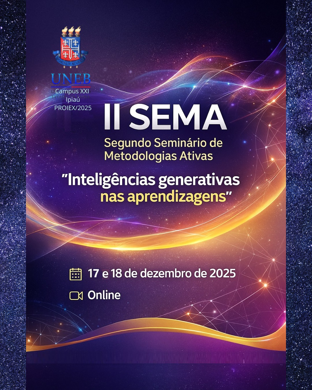 DCHTXXI Inscrição - 05/12/2025 à 16/12/2025II SEMA – Segundo Seminário de Metodologias Ativas UNEB – Campus XXI (Ipiaú/BA) Tema: Inteligências Generativas nas Aprendizagens O II SEMA, promovido pela UNEB – Campus XXI – Ipiaú é um encontro formativo que integra seres humanos, tecnologias generativas, práticas pedagógicas inovadoras e ancestralidades vivas, com foco na ativação de aprendizagens críticas, criativas e híbridas no Ensino Superior e na Educação Básica e em todas as etapas e modalidades. Promove uma educação emancipatória que integra práticas humanas, natureza, tecnologias generativas e metodologias de ativação cognitiva e socioemocional, através da MotuScientia (ciência em movimento). O evento propõe uma experiência imersiva, aprofundada, ampliada e expansiva, combinando conferências, oficinas e práticas interativas. Os/as participantes terão acesso a materiais disponíveis em pasta digital, para potencializar o percurso formativo, preparar o terreno das vivências e prosseguir com as ativações em conjunto com as InteliGens. Este evento marca uma inovação inédita na UNEB, no Brasil e no mundo ao ser o primeiro seminário acadêmico cocriado integralmente na interação híbrida entre seres humanos, Inteligências Generativas e a natureza — tanto em seu sentido vivo e ecológico quanto em sua dimensão ancestral, simbólica e formativa. Toda a concepção do II SEMA – da programação às metodologias de ativação – foi construída na hibridização entre inteligências humanas, tecnologias generativas e a natureza profunda dos processos educativos, compreendidos como expressão da vida em movimento. O seminário propõe, assim, uma experiência formativa pioneira que integra criticamente esses três planos de existência, abrindo caminhos para novas formas de aprender, ensinar, criar e conviver. ________________________________________________________________________________________________________________________________________ O II SEMA contempla 20 (vinte) horas certificadas, combinando atividades assíncronas e vivências síncronas, incluindo: Sala de Aula Invertida (pré-evento) – com materiais introdutórios e orientadores para preparação dos/as participantes; Conferências e oficinas (evento síncrono) – com especialistas nacionais e internacionais; 7 Trilhas de Ativação e Integração (pós-evento) – que aprofundam conceitos e práticas trabalhadas no seminário. São propostas atividades assíncronas orientadas, destinadas à consolidação das aprendizagens e à elaboração reflexiva do percurso formativo. A proposta integra conferencistas convidados, docentes da UNEB e atividades em ambientes digitais, visando fortalecer a formação docente crítica, híbrida e inovadora. Datas: 17 e 18 de dezembro de 2025 Formato: Online (Google Meet) – link será enviado à pessoa inscrita Certificação: PROIEX/UNEB – 20h Realização: UNEB – DCHT – Campus XXI - Ipiaú Inscrição: https://bit.ly/IISEMA2025-Uneb-Ipiau Materiais: – link será enviado à pessoa inscrita _______________________________________________________________________________________________________________________________________ PROGRAMAÇÃO PRÉ-EVENTO (Atividade Assíncrona – 4h) Sala de Aula Invertida – Acolhida e Ativação do Campo Formativo Período: 10 a 17 de dezembro de 2025 Atividade assíncrona realizada pelo/a participante Descrição: estudos iniciais, sensibilização e primeira ativação com Inteligências Generativas. ABERTURA – 17/12 (19h) Mesa Institucional UNEB Conferência: Transformações Educacionais na Era das Inteligências Generativas Paolla Miguel Mediação: Profª Ma. Izabel Cristina Lima Dias Alves (Bel) OFICINAS – 18/12 (14h às 18h) 14h–16h Oficina 1: InteliGens e Metodologias de Ativação Facilitadores: Profª Ma. Izabel Cristina Lima Dias Alves & Prof.@ Dr.@ Luz Fernando Franzoi 16h–18h Oficina 2: Inteligências Artificiais (IAs) na Educação: ChatGPT, Gemini e outras ferramentas para inovar o ensino Facilitador: Prof. William Gabalan (Convidado internacional UNEB) ENCERRAMENTO – 18/12 (19h30) Conferência: Da Ancestralidade às InteliGens: Hibridizações para uma Educação Emancipatória Prof. Dr. Reinaldo Borges Júnior Mediação: Profª Ma. Sayonara Miranda Oliveira PÓS-EVENTO (Atividade Assíncrona – 10h) 7 Trilhas de Ativação e Integração Período: 19 a 23 de dezembro de 2025 Atividade assíncrona realizada pelo/a participante Descrição: aprofundamento das práticas, elaboração reflexiva e integração dos conceitos do SEMA. ________________________________________________________________________________________________________________________________________ Coordenação Geral Profª Ma. Izabel Cristina Lima Dias Alves – Diretora Campus XXI UNEB–Ipiaú Profª Ma. Sayonara Miranda Oliveira – Colegiado de Letras Profª Drª Rosane Vieira – Pró-Reitoria de Extensão (UNEB) Prof. Dr. Cristiano de Sant’Anna Bahia – PPGE/UESC Ana Luíza Santos da Silva – Bolsista PROIEX/UNEB Prof.@ Dr.@ Luz Fernando Franzoi da Silva – Educador Popular