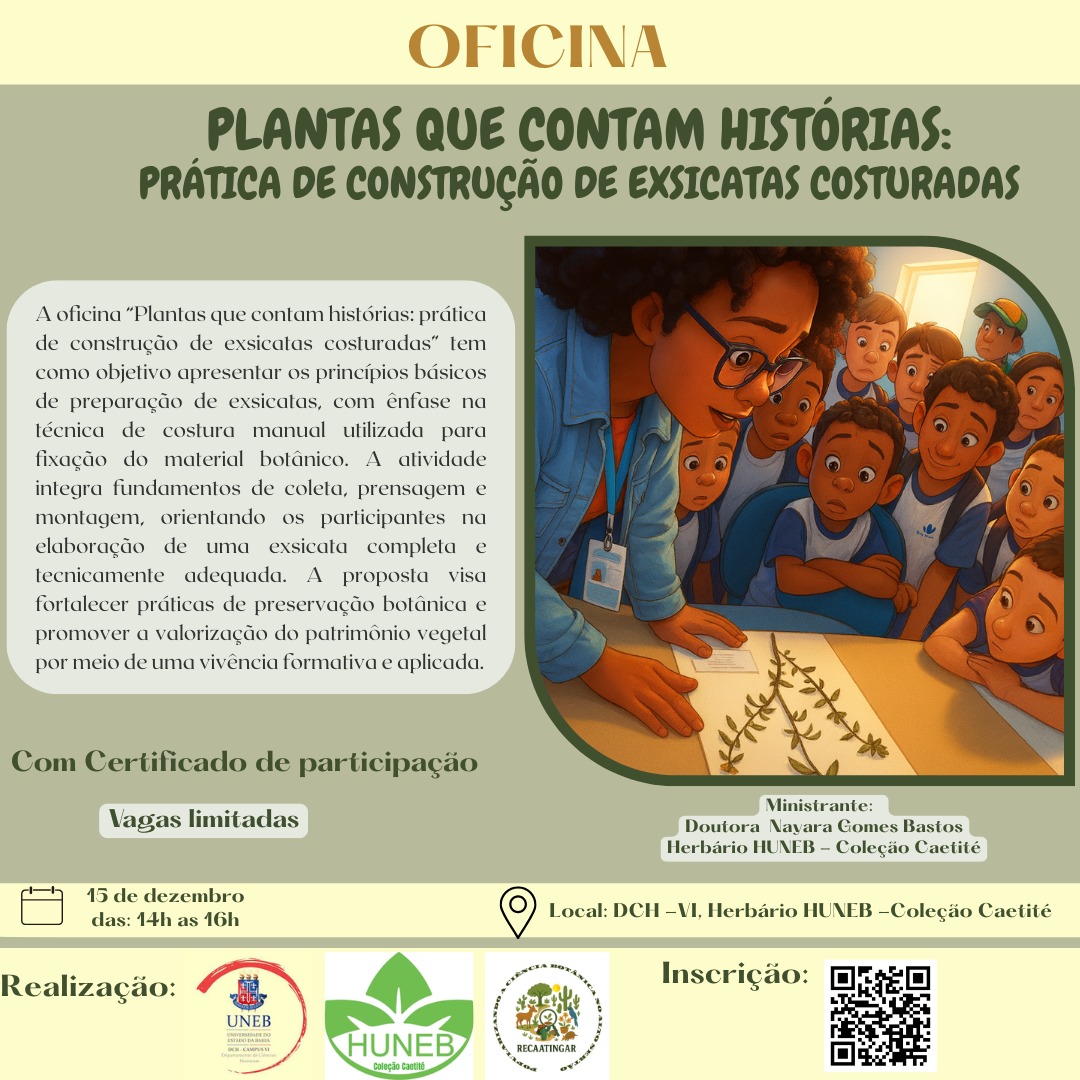 DCHVI Inscrição - 11/12/2025 à 15/12/2025A oficina “Plantas que contam histórias: prática de construção de exsicatas costuradas” tem como objetivo apresentar os princípios básicos de preparação de exsicatas, com ênfase na técnica de costura manual utilizada para fixação do material botânico. A atividade integra fundamentos de coleta, prensagem e montagem, orientando os participantes na elaboração de uma exsicata completa e tecnicamente adequada. A proposta visa fortalecer práticas de preservação botânica e promover a valorização do patrimônio vegetal por meio de uma vivência formativa e aplicada.