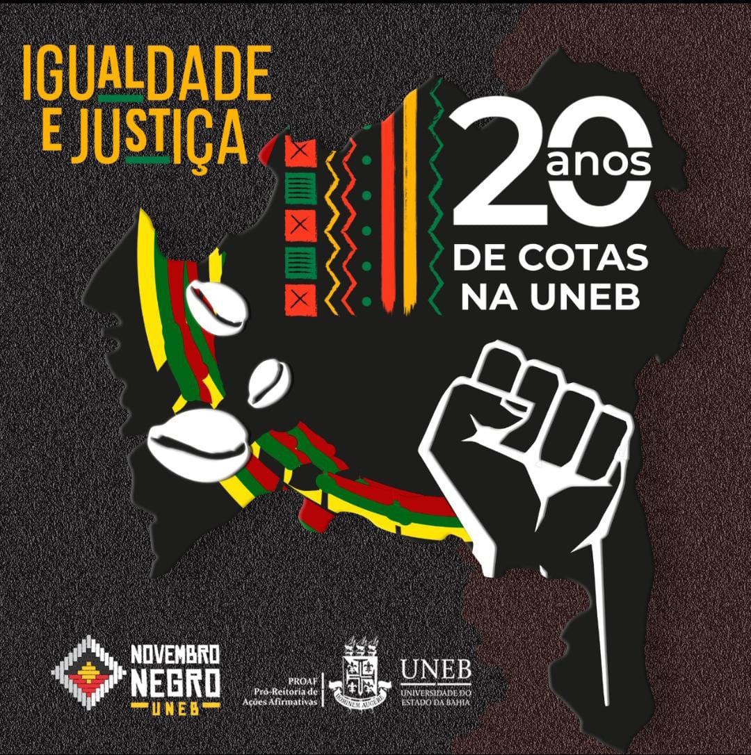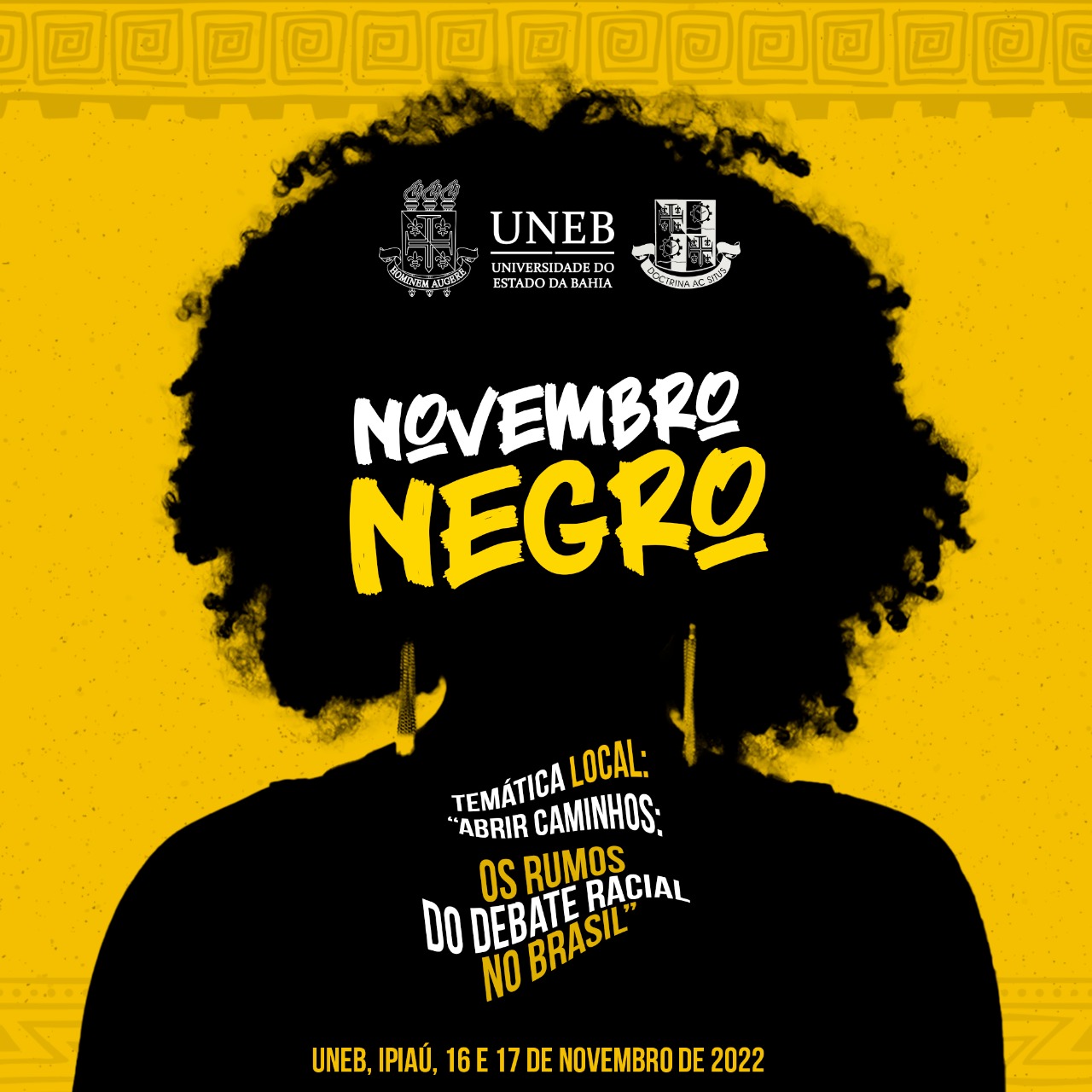 DCHTXXI Inscrição - 01/11/2022 à 16/11/2022O Departamento de Ciência Humanas e Tecnologias da UNEB - DCHT Campus XXI - Ipiaú, abre inscrição, de 01/11/2022 a 16/11/2022, para o evento NOVEMBRO NEGRO: "Abrir caminhos: existir e afirmar negritude no Brasil", cujas atividades acontecerão nos dias 16 e 17 de novembro de 2022. Pretendemos promover momentos de amplo debate e de discussão em torno da sociedade racialmente igualitária que queremos e apontar os caminhos de como devemos construi-la. Objetivamos proporcionar aos ouvintes momentos de reflexão sobre a resistência e luta do povo negro no Brasil e em Ipiaú; também, desenvolver a co-responsabilidade pela vida social como compromisso individual e coletivo; ainda, destacar as diferentes formas de racismo e discriminação através do resgate da memória cultural do povo negro; bem como, trazer à tona discussões provocantes, por meio das rodas de conversa, para um posicionamento mais crítico frente à realidade social em que vivemos.