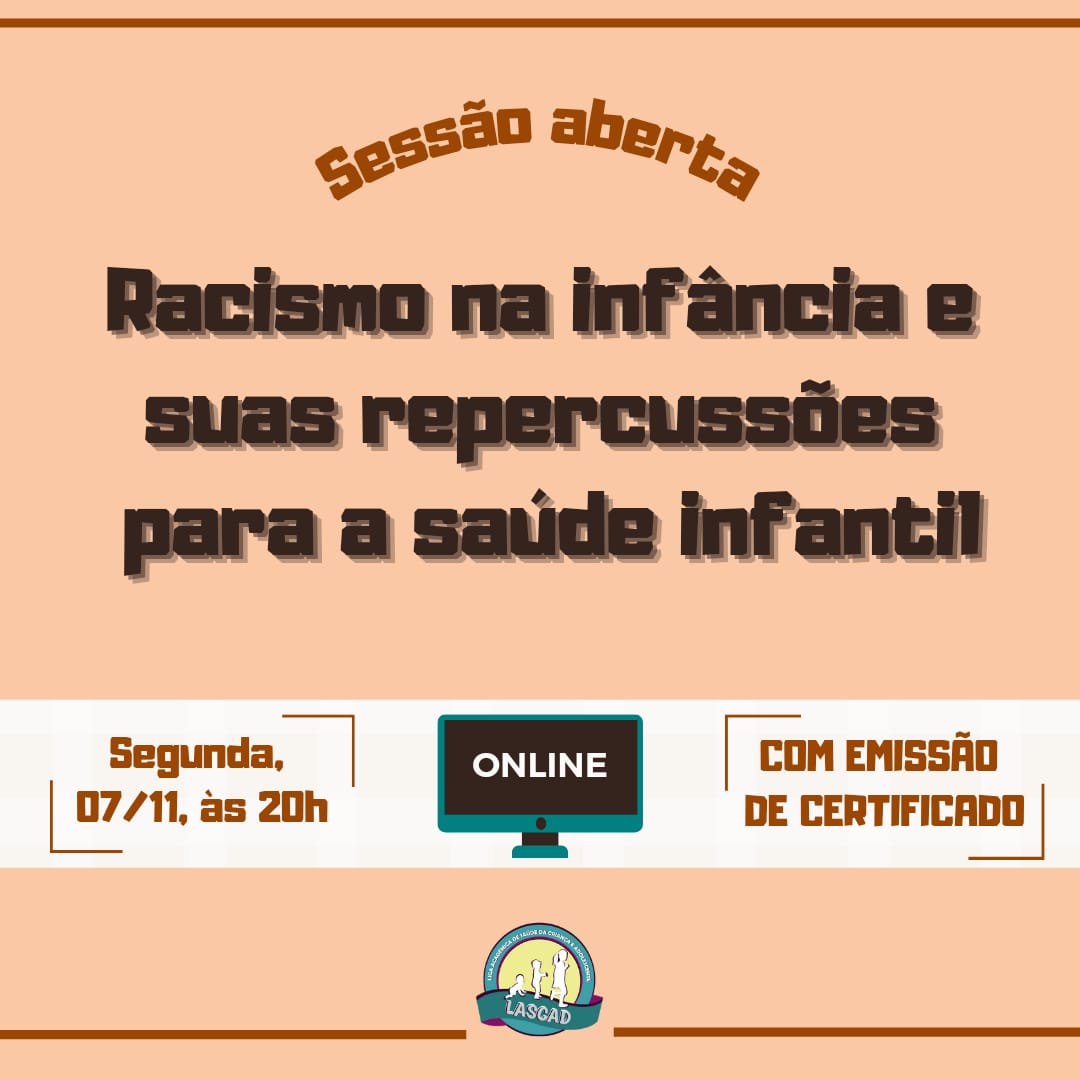 DCVI Inscrição - 03/11/2022 à 06/11/2022O racismo é um problema estrutural que afeta toda a população, sendo considerado uma violação dos direitos humanos. Imersos nesse cenário, as crianças e adolescentes podem ter impactos danosos do ponto de vista psicológico. Diante disso, é imprescindível discutir sobre a temática. Desaa forma, será realizada a Sessão Científica Aberta: Racismo na Infância e suas Repercussões para a Saúde Infantil, com a palestrante Suiane Costa, via Plataforma Microsoft Teams no dia 07 de novembro de 2022, às 20 horas.