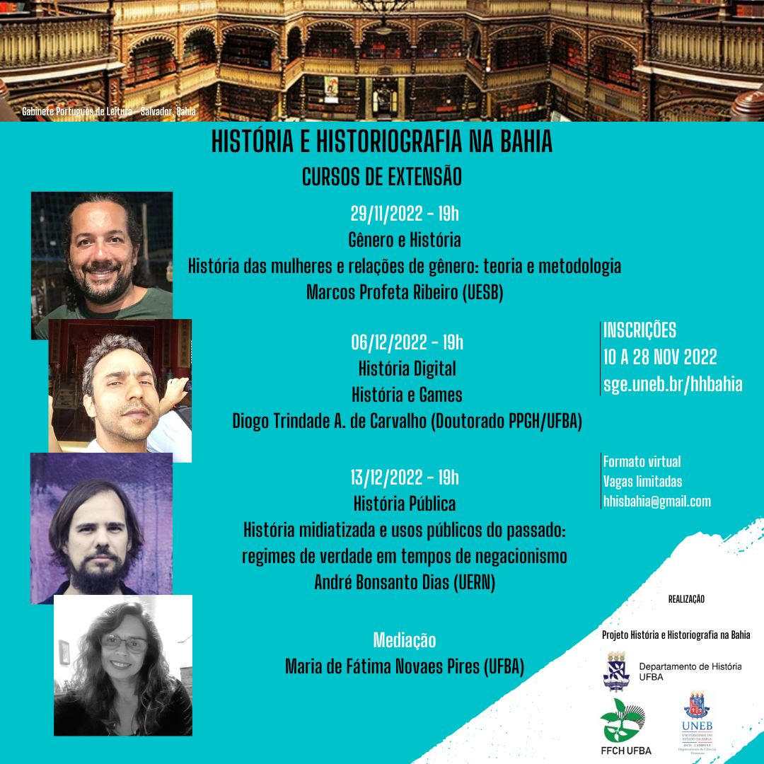 NUPE DCH I Inscrição - 10/11/2022 à 28/11/2022O projeto História e Historiografia na Bahia organiza e promove minicursos ministrados por docentes de diversas universidades da Bahia e do Brasil. Os minicursos, iniciados em 2019, tiveram continuidade em 2021, e seguem agora em sua terceira edição. As inscrições estão abertas entre 10 e 28 de novembro de 2022. As vagas são limitadas. Os cursos têm certificação com carga horária de 3h, cada, 9h no total. Para contato: hhisbahia@gmail.com. 29/11/2022, 19h Gênero e História História das mulheres e relações de gênero: teoria e metodologia Marcos Profeta Ribeiro (UESB) 06/12/2022, 19h História Digital História e Games Diogo Trindade Alves de Carvalho (Doutorado PPGH/UFBA) 13/12/2022, 19h História Pública História midiatizada e usos públicos do passado: regimes de verdade em tempos de negacionismo André Bonsanto Dias (UERN) Mediação: Maria de Fátima Novaes Pires (UFBA)