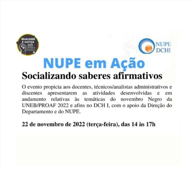 NUPE DCH I Inscrição - 16/11/2022 à 22/11/2022Modalidade: remota pela Plataforma TEAMS Programação: 14 h - Abertura com Diretor do DCH I - Prof. Flávio Dias dos Santos Correia 14h10min - Saudação do Prof. Marcelo Pinto, Pró-reitor de Ações Afirmativas (PROAF) da UNEB 14h20min - Apresentação do Projeto DCH I nas Escolas com Jacilene Fiuza de Lima e Maria Alice Sacramento, um panorama das ações do projeto no bairro do Cabula e entorno da UNEB 15h - Apresentação dos projetos de pesquisa e extensão da Profa. Edinélia Maria O. Souza, entre eles a proposta do Livro Paradidático Maria da Conceição - uma escravizada roubada 15h40min - Apresentação do grupo de pesquisa LEHISP com Profa. Aline Silva Gomes e bolsistas de extensão e pesquisa 16h10min - Apresentação do Projeto de Extensão Cine Clube DCHI/UATI com Elizângela da Conceição Pereira e Maria de Fátima Araújo Frazão 17h - Encerramento com as estatísticas do Nupe em Ação por Girlene Nunes Teixeira Inscrições: www.sge.uneb.br Modalidade: remota pelo TEAMS Certificado: 03 horas Informações: nupedch1@uneb.br