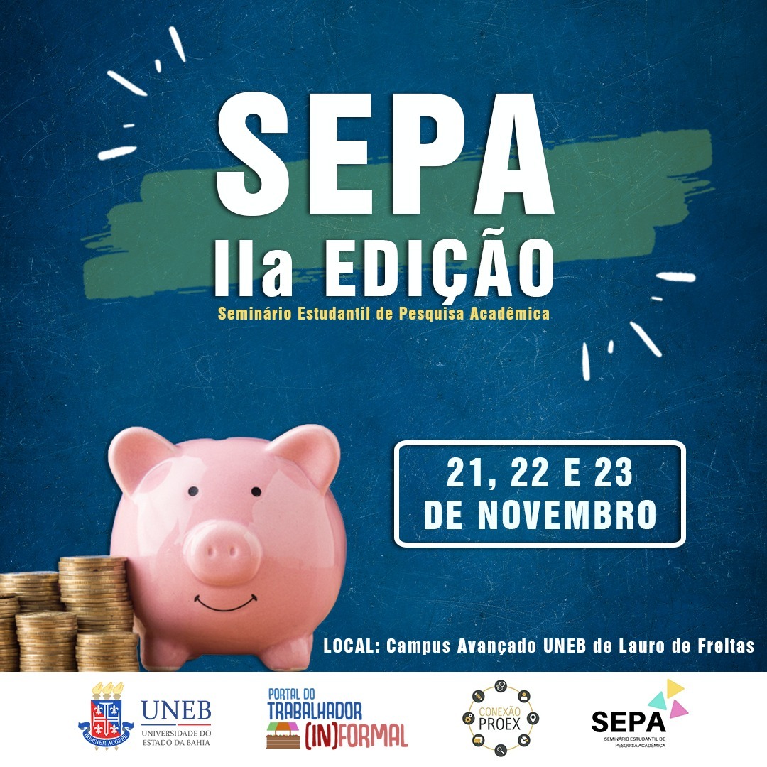 DCHTXIX Inscrição - 17/11/2022 à 24/11/2022I - INFORMAÇÕES SOBRE O EVENTO O Seminário Estudantil de Pesquisa Acadêmica (SEPA) é um evento construído pelos estudantes do curso de Bacharelado cm Ciências Contábeis, do Departamento de Ciências Humanas e Tecnologias (DCHT), Campus XIX, Camaçari, vinculado à Universidade do Estado da Bahia (UNEB). A primeira edição, realizada no período de 22 à 24 de novembro de 2021, foi promovida pela disciplina Mercado Financeiro e de Capitais, cujo tema central foi "Alem das máscaras: Gestão, Cybersegurança e Inovações do Mercado Financeiro durante a pandemia", buscou trazer à discussão, reflexões sobre o segmento financeiro do país, dando ênfase aos desdobramentos causados pela pandemia da COVID-19, das oficinas temáticas originárias de pesquisas científicas inéditas, em 3 linhas de estudo: A)Gestão; B)Cybersegurança, C)Inovações. A IIª Edição do SEPA será promovida pelos discentes do segundo semestre, matriculados na disciplina Economia das Organizações, conduzida pela Profa. üra. Josete Ribeiroe será realizada no período de 21 à 23/11/22. O objetivo principal desta edição e promover o debate sobre o comportamento do consumidor, a partir de 04(quatro) linhas de pesquisa: A) Hábitos de Consumo e Endividamento; B) Inclusão Financeira; C) Planejamento Financeiro; D) Investimentos. Baseando-nos nesta perspectiva, propomos discutir e socializar os resultados originários de uma pesquisa aplicada com grupos de amigos, familiares e pares do convívio social, através da utilização da metodologia de Grupos Focais, orientado pela Prof1 Dra, Sônia Pinto, regente da disciplina Metodologia do Trabalho Científico, onde foi possível coletar informações acerca dos temas abordados em cada uma das linhas de pesquisa supramencionadas. O tema central escolhido para a IIa Edição, e Pulando a fogueira do endividamento: Planejamento e Bem-estar Financeiro. II - EQUIPE ORGANIZADORA Docente Responsável Profa, Dra. Josete Bispo Ribeiro Docente Corresponsável Profa. Dra. Sônia Pinto Representantes Discentes do evento Amanda Araújo Polidade Gisele Alves Gomes dos Santos Representantes Discentes por linha de pesquisa Hábitos de Consumo e Endividamento: Luzia Silva de Britto Inclusão Financeira: Pietra Salgado da Silva Planejamento Financeiro e Orçamento Doméstico: Tatiane Conceição Tavares Costa, Investimentos: Esther Santana Argolo Pereira. III PROGRAMAÇÃO 21/11/2022 (Segunda-Feira). Horário: 8h às 12h. Oficina 01: Hábitos de Consumo e Endividamento. Palestrante: Luzia Silva de Britto. Carga horária: 2 horas Oficina 02: Inclusão Financeira. Palestrante: Pietra Salgado da Silva, Carga horária: 2 horas 22/11/2022 (Terça-Feira), Horário: 8h às 12h. Oficina 03: Planejamento Financeiro e Orçamento Doméstico. Palestrante: Tatiane Conceição Tavares Costa Carga horária: 2 horas Oficina 04: Investimentos. Palestrante: Esther Santana Argolo Pereira. Carga horária: 2 horas 23/11/2022 (Quarta-Feira), Horário: 8h às 12h. Palestra de Encerramento: "A carreira do contador e os desafios da conscientização financeira dos empresários". Palestrante: Samori Samori N'Diaie Cardoso Ferreira Sorteio de livros Carga horária: 4 horas LOCAL DO EVENTO Auditório do Campus Avançado em Lauro de Freitas (CALF) - UNEB Rua. Ver. Jone Kiss, 258 - Parque Santa Julia, Lauro de Freitas - BA