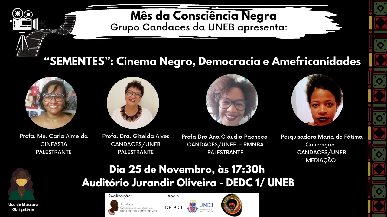 NUPE DEDC I Inscrição - 18/11/2022 à 25/11/2022No mês da Consciência Negra, o Grupo de Pesquisa e de Estudos CANDACES: gênero, raça, cultura & sociedade, da Universidade do Estado da Bahia, Campus 1, certificado pelo CNPq, traz como tema a ser analisado: “SEMENTES: Cinema Negro, Democracia e Amefricanidades”. Abordaremos temáticas interseccionais ao cinema negro feminino; às lutas políticas das mulheres negras por democracia e as lições de “Amefricanidades” contidos na obra SEMENTES (2020), dirigido por Éthel Oliveira e Júlia Mariano. O foco do nosso olhar, será a presença das mulheres negras à frente das câmeras no protagonismo do cinema e das lutas por democracia, e atrás das câmeras na direção cinematográfica. Data: 25/11/2022Horário: 17h30 CARGA HORÁRIA 2h Coordenação Geral: Prof. Dr. Valdélio Santos Silva 50 VAGAS PROGRAMAÇÃO DATA: 25 DE NOVEMBRO- DEPARTAMENTO DE EDUCAÇÃO, CAMPUS-I-UNEB- SALVADOR-BA 17:30 Abertura com saudação ao evento e ao público: Profa. Dra. Carla Liane Nascimento dos Santos- Diretora do DEDC-I-UNEB Pesquisadora Maria de Fátima Conceição dos Santos- ( Coord..Ciclo de Estudos CANDACES da UNEB) Profa. Dra. Gizelda Alves ( Coord..Ciclo de Estudos CANDACES da UNEB) Prof. Dr Valdélio Santos Silva ( Coord. Geral do Projeto) 17:45 Início da Exibição do Filme “Sementes” com duração de 100 minutos. 19:25 Início da Roda de Conversa PALESTRANTES: Profa. Me. Elicarlas Almeida Rosário Profa. Dra. Gizelda Maria Alves Hengstl ( CANDACES/UNEB) Profa Dra Ana Cláudia Pacheco ( CANDACES/UNEB e Rede de Mulheres Negras da Bahia) Mediação: Pesquisadora Maria de Fátima Conceição dos Santos ( CANDACES/UNEB) 20:30 Encerramento da Atividade
