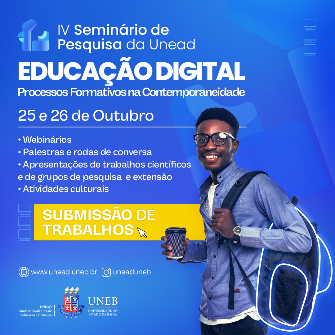 UNEAD Inscrição - 16/08/2022 à 30/09/2022SUBMISSÃO DE RESUMOS - IV SEMINÁRIO DE PESQUISA DA UNEAD Acesse o formulário para envio dos links referentes as apresentações dos resumos aprovados: http://bit.ly/3SD1ak4 ]O IV Seminário de Pesquisa da UNEAD – UNEB, tem como finalidade promover diálogos entre múltiplos atores e perspectivas com base nas experiências, pesquisa cientifica e tecnológicas, assim como nas atividades de extensão desenvolvidas no âmbito da UNEAD. O evento será organizado em salas formativas que se constituem em espaços para exposição, apresentação e discussão de trabalhos, estudos e projetos elaborados pela comunidade acadêmica e externa que empreenderam ações desenvolvidas no campo da pesquisa. Para tanto, é proposto como tema nesta edição “EDUCAÇÃO DIGITAL: PROCESSOS FORMATIVOS NA CONTEMPORANEIDADE", tendo como eixos norteadores: Eixo 1: Práticas e alternativas para inclusão digital e a educação inclusiva; Eixo 2: ON-LIFE: A educação digital no campo do conhecimento, nas práticas da vida e na interação social e Eixo 3: Alternativas tecnológicas e digitais que ampliem a comunicação, interação e socialização para a cultura digital. CRONOGRAMA DAS ATIVIDADES ATIVIDADE PERÍODO Inscrição como OUVINTE 16/08 a 25/10/22 Submissão de Trabalhos (Resumo Informativo) 16/08 a 30/09/22 Divulgação do resultado dos Resumos aprovados 04/10/22 Envio do link do vídeo, do YouTube, do Resumo do Trabalho Aprovado, no SGE 05/10 a 11/10/22 Divulgação do resultado dos vídeos aprovados para apresentação dos Trabalhos – Resultado Final 21/10/22 Divulgação das gravações dos Trabalhos aprovados no canal Unead no Youtube A partir de 25/10/22 Maiores informações: Instagram: @uneaduneb E-mails: ivpesunead@uneb.br / cientivpesunead@uneb.br (Comissão Científica).