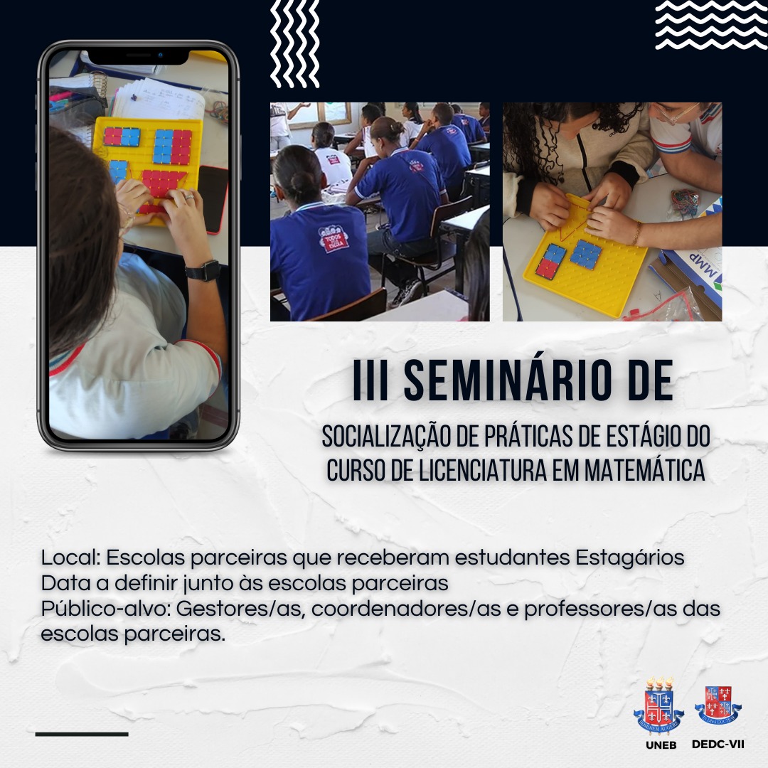 DEDCVII Inscrição - 20/06/2022 à 14/07/2022O III Seminário de Socialização de Práticas de Estágio do Curso de Licenciatura em Matemática é uma atividade de extensão articulada a disciplina de Estágio Supervisionado IV, do curso de Licenciatura em Matemática do Departamento de Educação do Campus VII, e nasce da importância de envolver as escolas parceiras no movimento de socialização das experiências de estágio ocorridas no semestre 2022.1. Nesse sentido, portanto, este seminário objetiva discutir as potencialidades do estágio, enquanto articulador de parcerias entre a universidade e as instituições parceiras, em busca de uma melhor qualificação profissional desses estudantes. LOCAL: Escolas parceiras que receberam estudantes estagiários DATA: A definir junto as escolas parceiras PÚBLICO-ALVO: Gestores/as, coordenadores/as e professores/as das escolas parceiras. CARGA-HORÁRIA: 5 HORAS