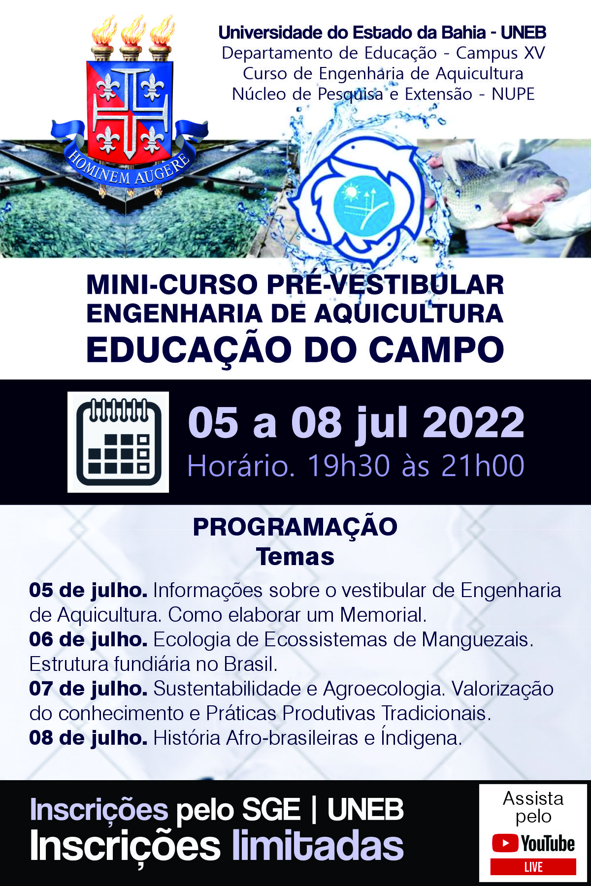 DEDC-XV Inscrição - 01/07/2022 à 08/07/2022Mini-curso Pré-vestibular Engenharia de Aquicultura/ Educação do Campo. Uneb Campus XV- Valença O objetivo desta atividade é realizar uma revisão dos assuntos que serão objeto da prova do Vestibular de Engenharia de Aquicultura e tirar possíveis dúvidas sobre os conteúdos, para os candidatos inscritos. O Departamento de Educação - Campus XV da UNEB, em parceria com o Fórum de Educação do Campo do Baixo Sul da Bahia e com o Grupo de Pesquisa Doc Form da UFRB, realizarão do dia 05 ao dia 08 de julho um minicurso preparatório para o Vestibular de Engenharia de Aquicultura do Campus XV da UNEB em Valença, através das plataforma digital do Youtube. A atividade se justifica por ser este o primeiro curso superior em pedagogia da Alternância do Baixo Sul da Bahia, cujo projeto Pedagógico foi elaborado com a participação do Conselho de Desenvolvimento Territorial do Baixo Sul da Bahia, Eixo Pesca e Bahia Pesca, sendo voltado para as populações do Campo, especialmente Pescadores(as) artesanais, Aquicultores(as) familiares, agricultores(as) familiares, comunidades quilombolas e demais populações do Campo. Em que pese serem todos os temas parte de conteúdos programáticos das disciplinas do Ensino médio, observa-se uma defasem na aprendizagem dos conteúdos que dizem respeito ás questões políticas, econômicas, culturais, biológicas, ecológicas, tecnológicas e socioambientais que envolvem a vida dos povos do Campo. Sendo um vestibular com características específicas, justificamos a necessidade de uma preparação apropriada para melhor resultado e acesso das populações do campo no Curso de Engenharia de Aquicultura do Campus XV da UNEB- Valença. COMO POSSO ME INSCREVER? Para participar do evento pelo YouTube, você deverá se inscrever no site do Sistema de Gerenciamento de Eventos (SGE) da Universidade do Estado da Bahia (UNEB), ingressando no link disponibilizado neste texto-convite. PERÍODO DE INSCRIÇÃO: 01/07 a 08/07/2021. CLIQUE AQUI PARA INSCRIÇÃO. http://www.sge.uneb.br/inicio/index?tipo=1 ONDE POSSO ASSISTIR O EVENTO? Todos os eventos mediados por tecnologias de digitais de transmissão de áudio e vídeo podem ser acessados no site do Canal de Apontamento de Pesquisas no YouTube, pelo celular, pelo tablet ou pelo computador. https://www.youtube.com/watch?v=F3RQJuynPts O evento conta com certificado de participação expedido pela própria instituição, com carga horária de 4 horas. Para ter direito ao certificado, o participante inscrito deverá preencher o formulário de frequência, disponibilizado pelos monitores no dia do evento. *MAIORES INFORMAÇÕES:* Acesso o nosso WhatsApp Institucional 71 9 9218-4693. Contamos com a sua presença!
