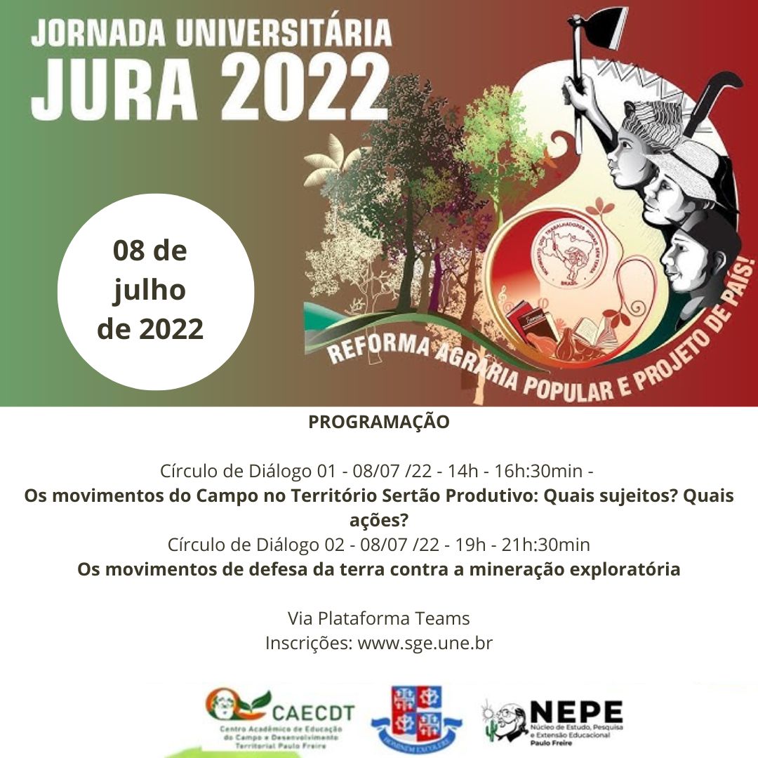 DEDCI Inscrição - 05/07/2022 à 08/07/2022UNIVERSIDADE DO ESTADO DA BAHIA PROGRAMA DE PÓS-GRADUAÇÃO EM EDUCAÇÃO DO CAMPO DEPARTAMENTO DE EDUCAÇÃO CAMPUS XII Jornada em Defesa da Reforma Agrária - JURA 2022 Programação: 08/07/2022 Horário: 14h - 16h30min Local: Pelo Teams Círculo de Diálogo 01 "Os movimentos do Campos no Território Sertão Produtivo: quais sujeitos? Quais ações? Rafael Augusto - Movimento Pela Soberania Popular na Mineração - MAM Andréa Muniz Lisboa - Movimento Pela Soberania Popular na Mineração - MAM Leila Lobo - Campanha Águas que Brotam vidas 08/07/2022 Horário: 19h - 21h30min Local: Pelo Teams Círculo de Diálogo 02 Os movimentos de defesa da terra contra a mineração exploratória José Coqueiro -centro de Agroecologia do Semiárido-CASA Antônio Nunes Santana - Polo Sindical da Região de Guanambi Anei Rodrigues de Oliveira - Movimento de Mulheres Camponesas - MMC Simone Jesus - Movimento Pela Soberania Popular na Mineração - MAM