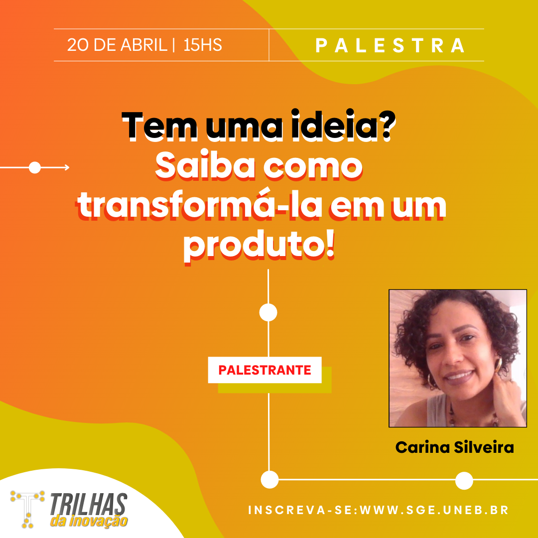 PPG Inscrição - 12/04/2022 à 26/04/2022O projeto Trilhas da Inovação traz em sua segunda atividade de 2022 a palestra: "Tem uma ideia? Saiba como transformá-la em um produto". A atividade será realizada no dia 20 de abril de 2022, a partir das 15h, com transmissão pelo canal da AUI no Youtube. O evento terá a participação da professora doutora em Artes Visuais (UFBA), mestre em Engenharia (UFBA) e designer de produto (UNEB), Carina Silveira, que abordará conceitos relacionados à concepção de um produto e sua materialização. Temas como Design Thinking, Modelo de Pensamento Criativo, Metodologia de Desenvolvimento Integrado de Produto serão abordados no sentido de apresentar ao público estratégias de planejamento metodológico e sistemático para criar um produto ou um serviço. Essa atividade é aberta à toda comunidade. Inscreva-se!!!!