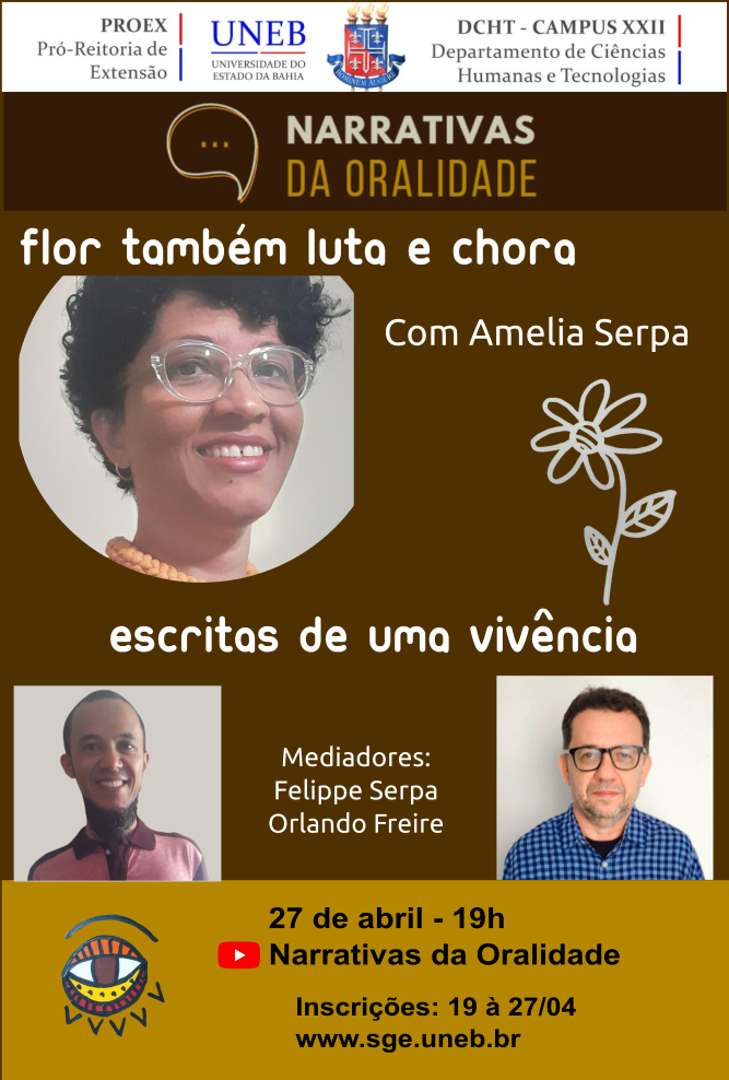 DCHTXXII Inscrição - 19/04/2022 à 27/04/2022Evento do Projeto Narrativas da Oralidade que proporciona conversas com narradores/as e seus saberes. Para a primeira edição desse ano, os professores Felippe Serpa e Orlando Freire (coordenadores) trazem a multiartista Amelia Serpa numa Live-prosa intitulada "Flor também luta e chora: escritas de uma vivência".