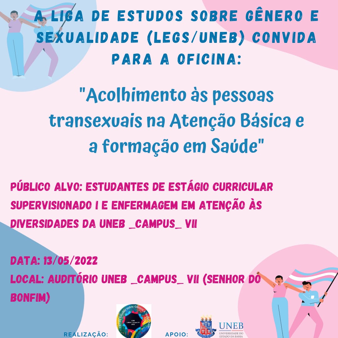 DEDCVII Inscrição - 18/04/2022 à 09/05/2022A oficina intenciona oportunizar o grupo de estudantes e docentes do campus VII, mais especificamente estudantes da Liga de Estudo sobre Gênero e Sexualidade, estudantes e docentes do último período do curso de Enfermagem (ECS I) e estudantes e docentes do componente Enfermagem em Atenção às Diversidades a dialogarem com profissionais experientes no atendimento de pessoas transexuais nos serviços de Atenção Básica. Este momento possibilitará contribuir com a formação de profissionais da enfermagem no que inclui a prestação de cuidados, escuta sensível, acolhimento e respeito às diferenças. PROGRAMAÇÃO MANHÃ: 09h - exibição do documentário Jakeliny Muricy - vida e obra de uma artista trans sertaneja (Jakeliny Muricy estará presente para dialogar sobre o filme) 10h30 - transexualidade e travestilidade como determinante social da saúde ALMOÇO 13h30 - Política Nacional de Saúde Integral da População LGBT (Artur Alves - médico de Família e Comunidade / Danielle Bezerra - enfermeira ambulatório de acolhimento às pessoas trans) 14h30 - A Atenção Primária à Saúde acolhe a população trans? (Artur Alves e Danielle Bezerra) 16h - Compromisso e contribuições da universidade na formação de profissionais da enfermagem sensíveis ao acolhimento de LGBTs (Simone Santana e outros docentes da UNEB à confirmar) 17h - ENCERRAMENTO