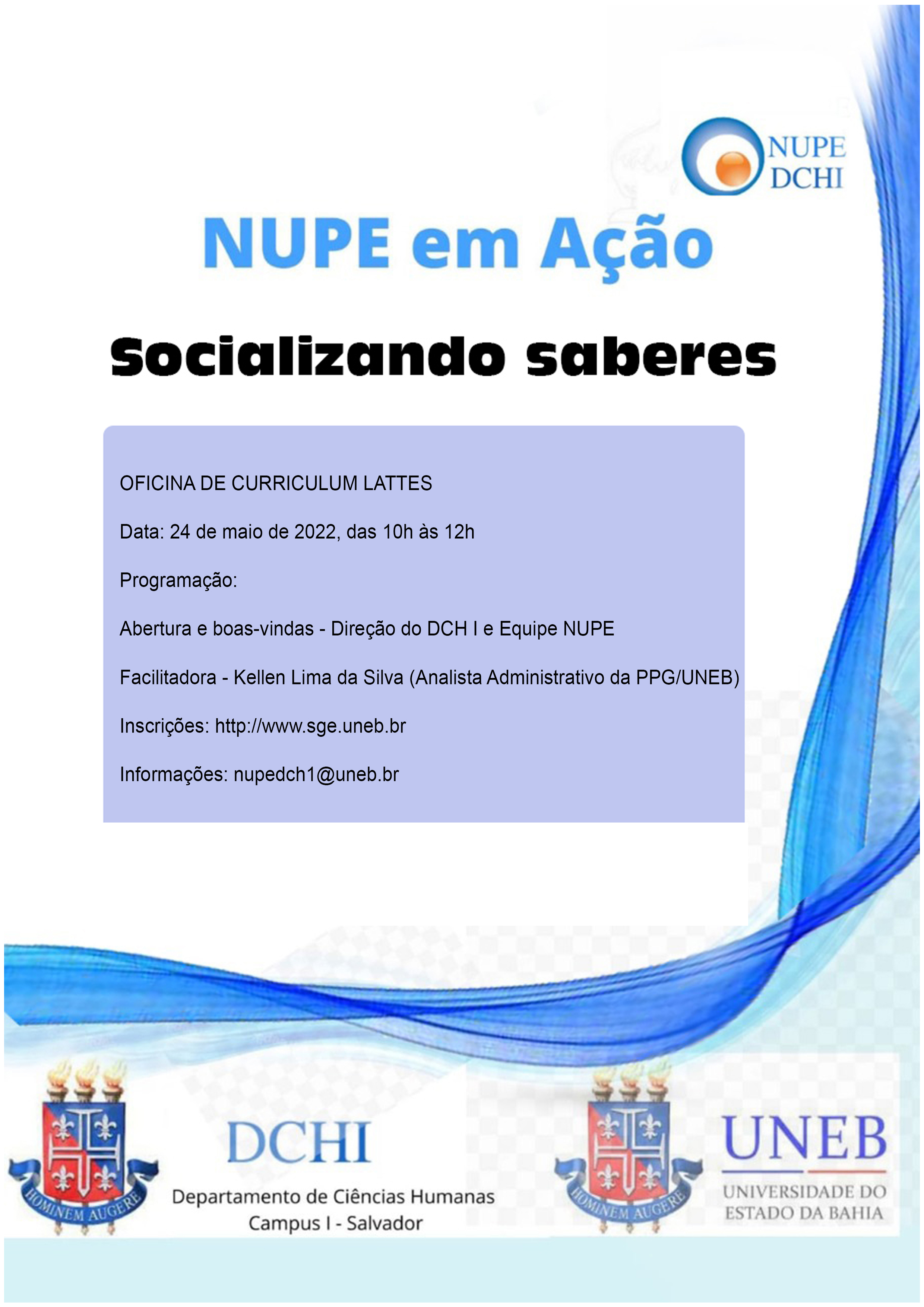 NUPE DCH I Inscrição - 20/04/2022 à 24/05/2022NUPE EM AÇÃO: SOCIALIZANDO SABERES Oficina de curriculum LATTES DATA: 24 de maio de 2022 das 10h às 12h PROGRAMAÇÃO Abertura e boas vindas - Direção do DCH I e equipe NUPE Facilitadora - Kellen Lima da Silva (Analista Administrativo da PPG/UNEB) Inscrições: http://www.sge.uneb.br Informações: nupedch1@uneb.br