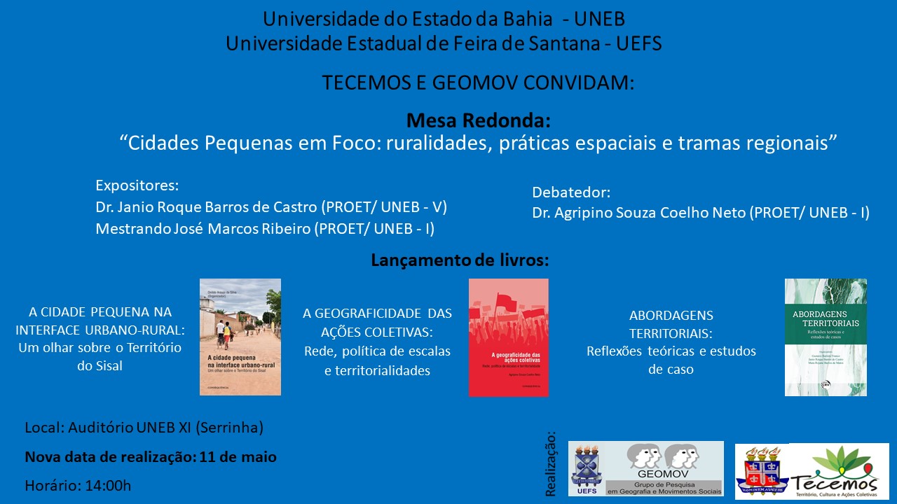 DEDCXI Inscrição - 25/04/2022 à 11/05/2022A Mesa Redonda intitulada “Cidades Pequenas em Foco: ruralidades, práticas espaciais e tramas regionais” será realizada no auditório da UNEB - Campus XI, no dia 11 de maio de 2022, às 14:00h. Essa é uma iniciativa promovida pelos Grupos de Pesquisa TECEMOS - UNEB e GEOMOV - UEFS. A Mesa Redonda contará com a participação dos expositores Dr. Janio Roque Barros de Castro (PROET – UNEB V), o Mestrando José Marcos Ribeiro (PROET-UNEB I) e, como debatedor, o Doutor Agripino Souza Coelho Neto (PROET - UNEB I). Posteriormente, teremos uma sessão de lançamento de duas publicações cujas investigações foram realizadas no Território do Sisal. São elas: - A CIDADE PEQUENA NA INTERFACE URBANO-RURAL: Um olhar sobre o Território do Sisal Autores: Agripino Souza Coelho Neto; Edinusia Moreira; Jamille Lima; Maria da Paz Rodrigues; Onildo Araujo; Oriana Silva - A GEOGRAFICIDADE DAS AÇÕES COLETIVAS: Rede, política de escalas e territorialidades. Autor: Agripino Souza Coelho Neto - Abordagens Territoriais: Reflexões teóricas e estudos de caso. Organizadores: Gustavo Franco, Janio Roque de Castro e Mara Rojane de Matos A atividade possui como público-alvo estudantes dos cursos de Geografia, Pedagogia e Administração, bem como os estudantes dos cursos de pós-graduação sediados no Campus XI. Esse evento acadêmico tem uma carga horária estipulada de 04 horas e, de acordo com as normas do Comitê de Biossegurança, terá um público limitado em 52 participantes.