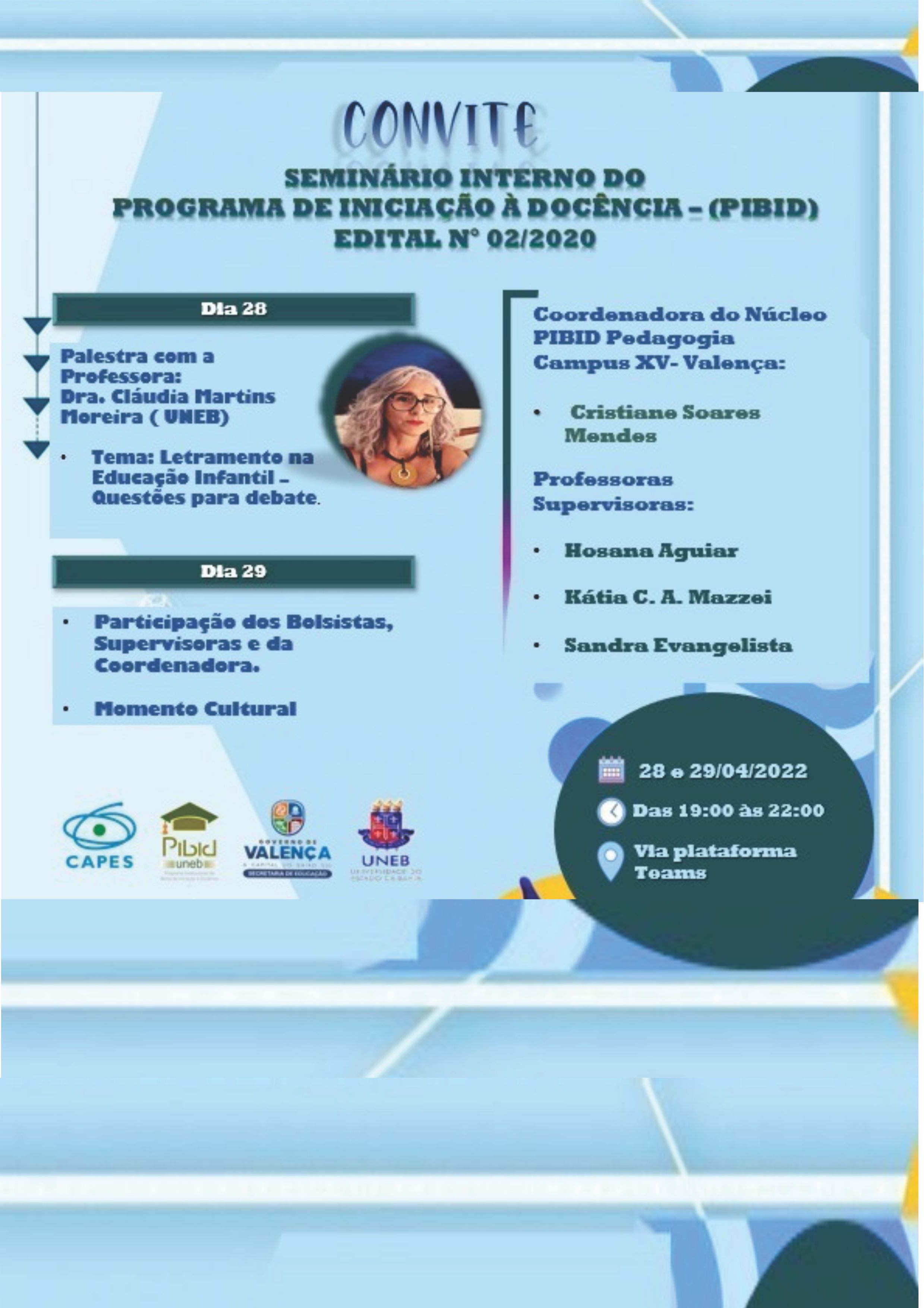 DEDC-XV Inscrição - 27/04/2022 à 29/04/2022UNIVERSIDADE DO ESTADO DA BAHIA - UNEB DEPARTAMENTO DE EDUCAÇÃO - CAMPUS XV COLEGIADO DO CURSO DE PEDAGOGIA NÚCLEO DE PESQUISA E EXTENSÃO - NUPE CONVITE PIBID nº 01/2022. A Universidade do Estado da Bahia (UNEB), através do Colegiado de Pedagogia do Departamento de Educação, Campus XV e Do Programa de Iniciação à docência (PIBID) Núcleo convida toda comunidade para participar do evento acadêmico Seminário Interno do PIBID do subprojeto Docência na Educação Infantil: letramento e saberes interdisciplinares, em formato de mediação tecnológica, com transmissão via Microsoft Teams. O evento acontecerá nos dias 28 e 29 de abril de 2022 com programação em anexo a este texto-convite. Este evento propõe apresentação dos relatos de experiências dos bolsistas do programa referente ao Edital 02/2020 da Capes. OBJETO E JUSTIFICATIVA DO EVENTO. No dia 30 de abril, concluiremos o Programa PIBID, entendemos que é chegado o momento de conversamos sobre nossas experiências, nossos desafios e nossas conquistas ao longo do período que, como sabemos, foi por demais atípico. As ações do projeto ampliam e contribuem para a formação docente dos Ids. Assim, através do seminário poderemos possibilitar as trocas, compartilhar experiências, e realizar avaliação entre os grupos, a fim de socializarmos e refletirmos nossa experiência, como previsto no edital 02/2020 da Capes. Importa registrar que a participação das professoras das escolas-parceiras e de todos os bolsistas foi por demais importante em toda trajetória do programa. Esperamos por todas (os) !! PROGRAMÇÃO DO SEMINÁRIO INTERNO DO PIBID Data: 28 /04/2022 Horário: 19:00 hs Palestrante convidada: Profa. Dra. Cláudia Martins Moreira (UNEB) Tema: Letramento na Educação Infantil: questões para debate Mediação: Professora Cristiane Soares Mendes Dia 29/04/2022 Relato de experiências dos Bolsistas de Iniciação à Docência Supervisora Hosana de Almeida Aguiar 1.Eduarda Santos Araújo 2.Perla Santana Muniz 3.Ana Paula Sousa dos Santos 4.Raniele de Jesus Santos 5.Ingrid Muniz Pereira 6. Fernanda dos Santos 7. Jose Santana Silva 8.Girlandia Santos Conceição Supervisora Kátia Cristina Almeida Mazzei 1. Helena Cerqueira dos Santos 2. Barbara da Silva Santana 3. Ducaiá teles de jesus dos santos 4. Ana Rita Palma Cardoso 5. Trycia Mayllane da Conceição 6. Jerlaine Brito Cardoso 7. Caroline dos Santos Soares 8. Maria Victória Campos R. Fonseca 9. Lorena Santos Cova Supervisora Sandra dos Santos Evangelista 1. Isabele Trindade de Araújo 2.Camila Vitória Oliveira Leal 3.Margarida Santos da Silva 4. Elaine de Jesus dos Santos 5. Ademilton de Santana dos Santos 6. Bianca Sacramento Coutinho 7. Mailan Freitas Barnabé Souza 8. Sheila de Jesus Santos
