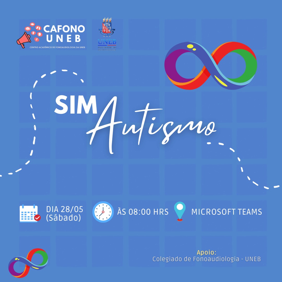 DCVI Inscrição - 10/05/2022 à 28/05/2022O VI Simpósio sobre Autismo da UNEB - VI SIMAUTISMO é um evento organizado anualmente pelo Centro Acadêmico de Fonoaudiologia da UNEB em formato de Simpósio, com vistas a atualização científica na temática. Data: 28 de maio de 2022 com transmissão online e ao vivo pela Plataforma TEAMS. Realização e Organização: CAFONO UNEB – Gestão 2022–2023 Coordenação científica: Profa. Dra. Júlia Escalda e Prof. Dr. Marcos Banhara Apoio: Colegiado de Fonoaudiologia da UNEB.