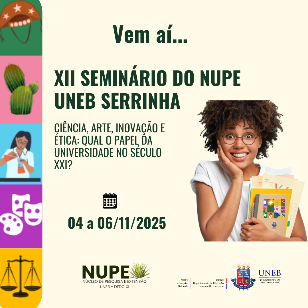 DEDCXI Inscrição - 29/09/2025 à 06/11/2025O Seminário do NUPE O Seminário do Núcleo de Pesquisa e Extensão é um evento anual do Departamento de Educação (DEDC), Campus XI - Serrinha da Universidade do Estado da Bahia (UNEB), organizado e realizado pelos diversos segmentos que compõem a comunidade acadêmica. O Seminário pretende fortalecer a trajetória da extensão e da pesquisa, assim como pretende dar espaço para socialização dos conhecimentos produzidos, pelos diversos sujeitos e grupos de pesquisa constituídos, no Departamento de Educação. Além disso, também visa a ser espaço de aprofundamentos teóricos e metodológicos com vistas a dialogicidade entre os estudantes, docentes, pesquisadores e a comunidade externa frente ao contexto e demandas que afloram no cenário contemporâneo. Assim, será busca de todas as atividades propostas e que, em conjunto constituem o Seminário do NUPE, alavancar as discussões, debates, escutas e o exercício polifônico das vozes dos atores e atrizes sociais que edificam a história do CAMPUS XI, seja na condição de servidores, técnicos, docentes, discentes, egressos e colaboradores que estão imersos no território onde o CAMPUS XI tem suas raízes fincadas. Sendo assim, o coletivo de pessoas que edifica as ações do Núcleo de Pesquisa e Extensão, dialoga, partilha e colaborativamente constrói a história da pesquisa e extensão no CAMPUS XI e nos territórios onde atuamos, de modo que, ao propor a realização do XII Seminário do NUPE, trabalhamos incessantemente para que o ensino, a pesquisa e extensão resista e se comprometa, sobretudo, com a educação pública, a escola de educação básica e com a classe trabalhadora. Neste sentido, este evento pretende tornar públicas as ações de ensino, pesquisa e extensão realizadas no contexto do departamento destacando o papel político, social, humano da Universidade do Estado da Bahia, em especial o CAMPUS XI, no Território do Sisal. Objetivos Promover o debate sobre a racionalidade neoliberal, a ideia de universidade pública presente nesta racionalidade, os impactos na ideia de ensino, pesquisa e extensão; Apresentar a produção do conhecimento do Departamento de Educação da UNEB (Serrinha) para a comunidade interna e externa como um ato de resistência territorial; Ampliar o diálogo com a Educação Básica, os movimentos sociais, a rede de economia solidária, os sindicatos e as organizações governamentais e não governamentais do Território do Sisal, através dos trabalhos apresentados nas sessões de comunicação e posters, bem como nas rodas de conversa; Oportunizar as condições para publicação das experiências científicas e extensionistas; ? Fortalecer as redes e grupos de investigação e cooperação no âmbito departamental, interdepartamental e interinstitucional; Viabilizar o debate sobre os limites e possibilidades da formação profissional nas áreas de Educação, Administração e Geografia no atual contexto da universidade pública; Integrar a comunidade da discussão, planejamento e desenvolvimento de ações de pesquisa e extensão no DEDC/XI. LINK DE INSCRIÇÃO PARA MONITORIA VOLUNTÁRIA: https://forms.office.com/r/8DP2CFM6gj Dúvidas sobre o processo de inscrição na modalidade Ouvinte e Submissão de Trabalhos, acesse nosso Tutorial.