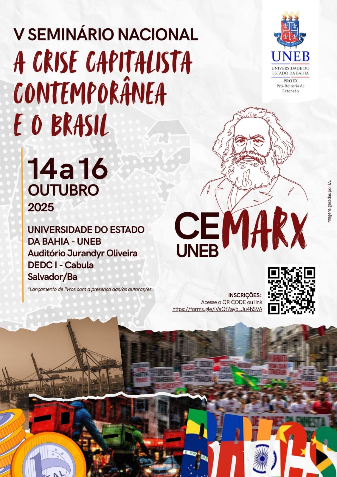PROEX Inscrição - 01/10/2025 à 13/10/2025Seminário discute a crise capitalista contemporânea: dias 14 a 16/10. Entre os dias 14 e 16 de outubro, no Auditório Jurandyr Oliveira, Departamento de Educação (DEDC) do Campus I da UNEB, em Salvador, acontecerá o V Seminário Nacional do Centro de Estudos Marxistas (Cemarx) da UNEB. Essa edição terá como tema “A crise capitalista contemporânea e o Brasil” e reunirá pesquisadores de diferentes universidades do país. O seminário tem como objetivo promover um debate sobre a crise societária contemporânea. Na programação de três dias, estão previstas mesas sobre as novas relações de trabalho e seus impactos sociais, a geopolítica mundial e a representação de classe na disputa política do Brasil. O evento é aberto ao público acadêmico e a comunidade externa. É necessário realizar inscrição prévia através de formulário online. Os inscritos que participarem de pelo menos 75% das atividades receberão certificado. O evento conta com apoio da Reitoria e da Pró-Reitoria de Extensão (Proex) da universidade. Confira aqui a programação do evento. Informações: email vfmfilho@uneb.br. Faça sua inscrição