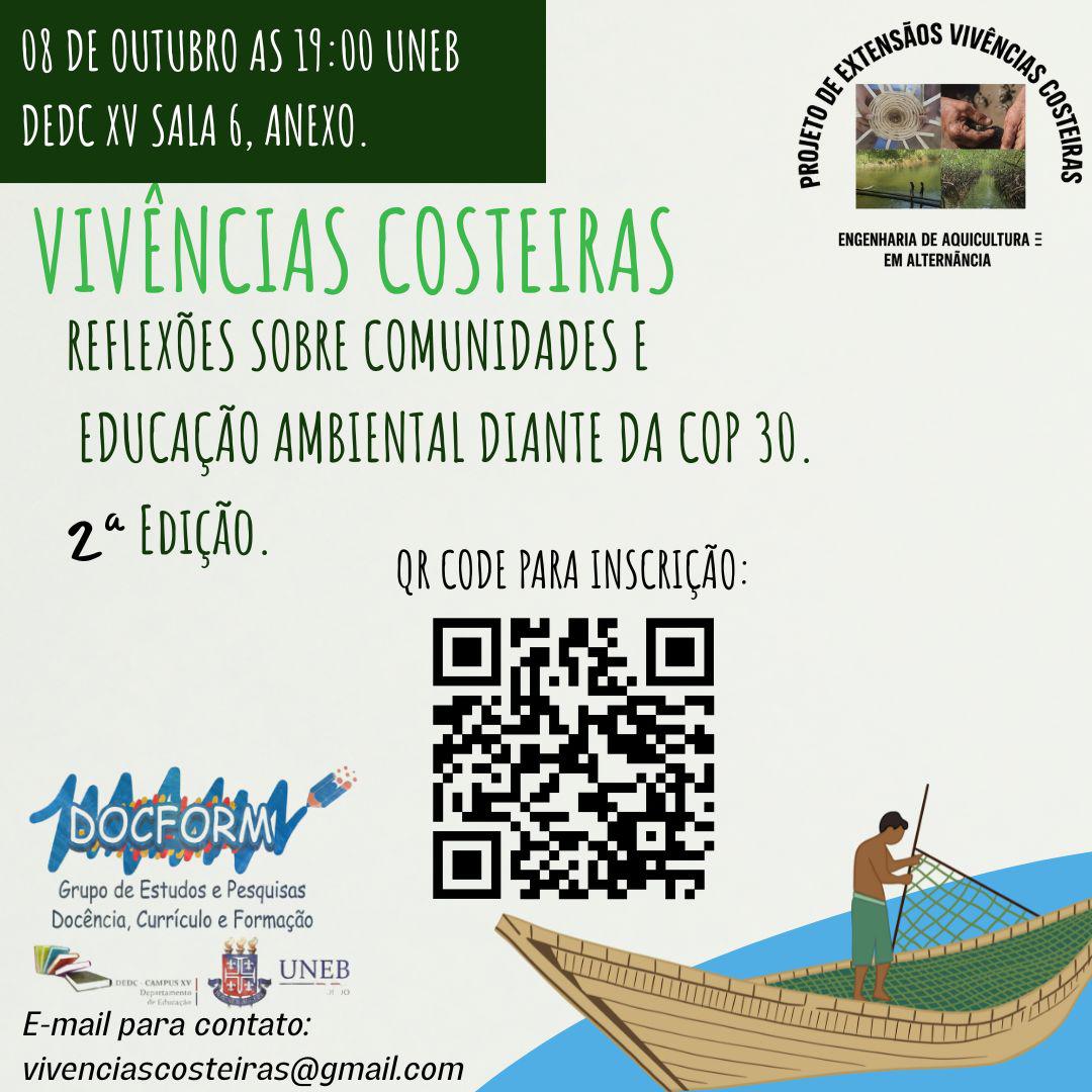 DEDC-XV Inscrição - 01/10/2025 à 08/10/2025O Seminário Reflexões sobre Comunidades e Educação Diante da COP 30 - 2ª Edição é organizado pela equipe do Projeto de Extensão Vivências Costeiras em parceria com o DOCFORM/UNEB. A realização será juntamente com a turma do componente: Metodologia de Ensino em Ciências Naturais 2025.2. Local: UNEB, DEDC 15, Sala 6 (anexo) Horário: 19h
