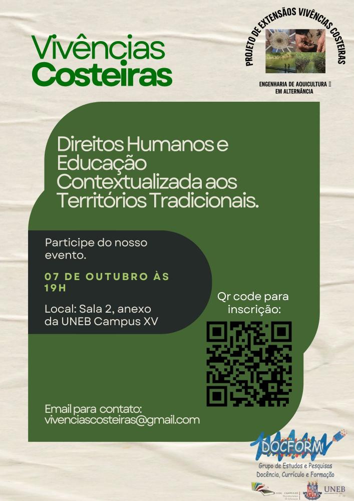 DEDC-XV Inscrição - 01/10/2025 à 07/10/2025A equipe do projeto de extensão Vivências Costeiras, juntamente com a turma de Licenciatura em Pedagogia de 2025.2 da UNEB (Campus XV) convida a todas e todos para participarem do seminário temático que partilhará experiências da educação em direitos humanos e diversidade e das imersões do referido projeto de extensão. Contamos também com o apoio dos Colegiados de Pedagogia, Engenharia de Aquicultura em Alternância, DEDC 15 e DOCFORM. Hora: 19h Local: Sala 2, anexo da UNEB - Campus XV