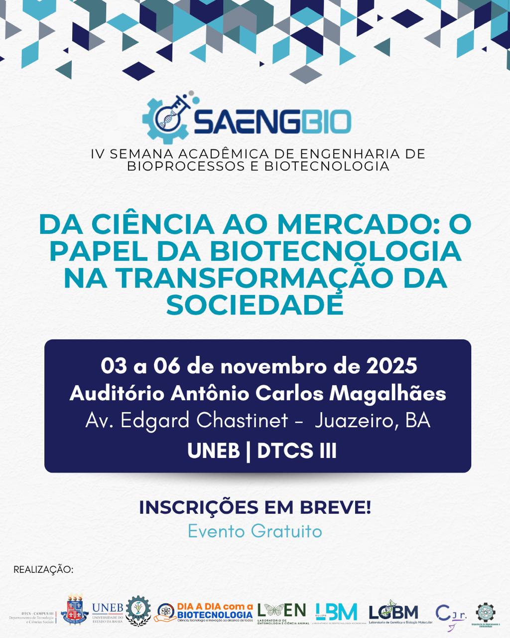 DTCSIII Inscrição - 06/10/2025 à 31/10/2025O SAENGBIO (Semana Acadêmica de Engenharia de Bioprocessos e Biotecnologia da UNEB) é um evento científico que visa integrar conhecimento, pesquisa e inovação nas áreas de bioprocessos e biotecnologia. Com o tema “Da ciência ao mercado: o papel da biotecnologia na transformação da sociedade”, esta nova edição destaca o impacto das aplicações biotecnológicas na geração de soluções sustentáveis, no avanço tecnológico e na melhoria da qualidade de vida. A programação do evento incluirá palestras, mesas-redondas, minicursos e apresentação de trabalhos. Com a submissão dos trabalhos devendo ser realizada de acordo com as instruções estabelecidas pela comissão científica do evento (arquivo anexo), até o dia 17 de outubro. As inscrições no evento são gratuitas, e serão efetivadas no dia do credenciamento, onde os inscritos são convidados a contribuir com 1kg de alimento não perecível. Todos os alimentos arrecadados serão direcionados para uma ação solidária, sendo destinados a pessoas em situação de vulnerabilidade social da região. Dessa forma, o SAENGBIO propõe um espaço de discussão e troca de experiências sobre como o conhecimento científico pode ser convertido em produtos, processos e serviços que impulsionam o desenvolvimento econômico e social.