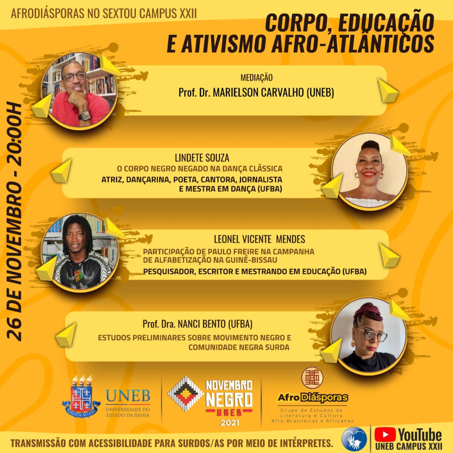 DCHTXXII Inscrição - 25/11/2021 à 27/11/2021O AfroDiásporas - Grupo de Estudos de Literatura e Cultura Afro-Brasileiras e Africanas, lotado na Uneb-Campus XXII-Euclides da Cunha, convida a tod_s para a roda de conversa "Corpo, educação e ativismo afro-atlânticos", dia 26 de novembro, nessa sexta agora, a partir das 20h, com a presença de Lindete Souza *@lindete.souza*, atriz, dançarina, poeta, cantora, jornalista e mestra em Dança (UFBA), Leonel Vicente Mendes *@leonelmendes10*, pesquisador, escritor e mestrando em Educação (UFBA) e Profa. Dra. Nanci Bento (UFBA) *@nanci_araujo*. O encontro aborda três temas relativos às pesquisas dos convidados para debatermos sobre racismo e colonialismo no campo das artes e da educação. A transmissão terá intérpretes para possibilitar mais acesso da comunidade surda a esses temas. O link para o canal está na bio. Compartihe. #novembronegro #afrodiasporas #marietarecomenda #danca #educacao #comunidadesurda #acessibilidade