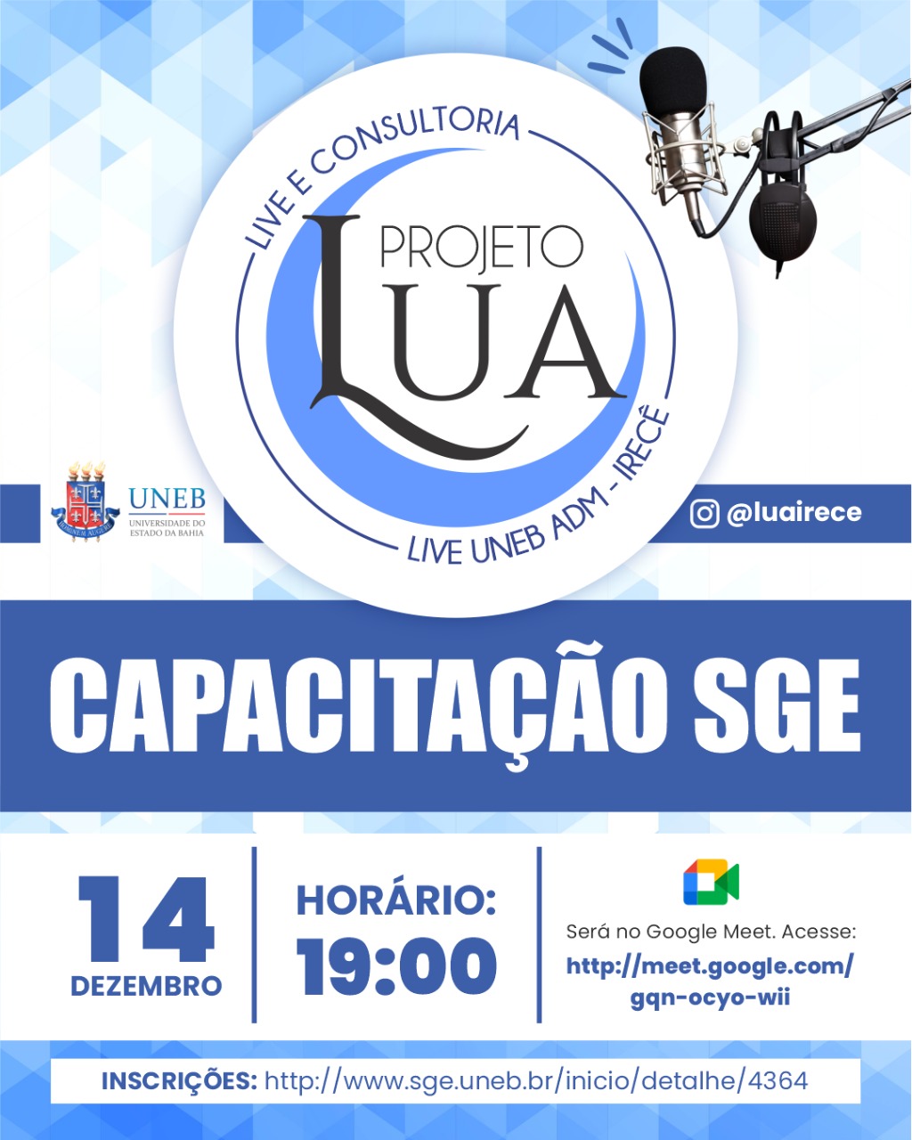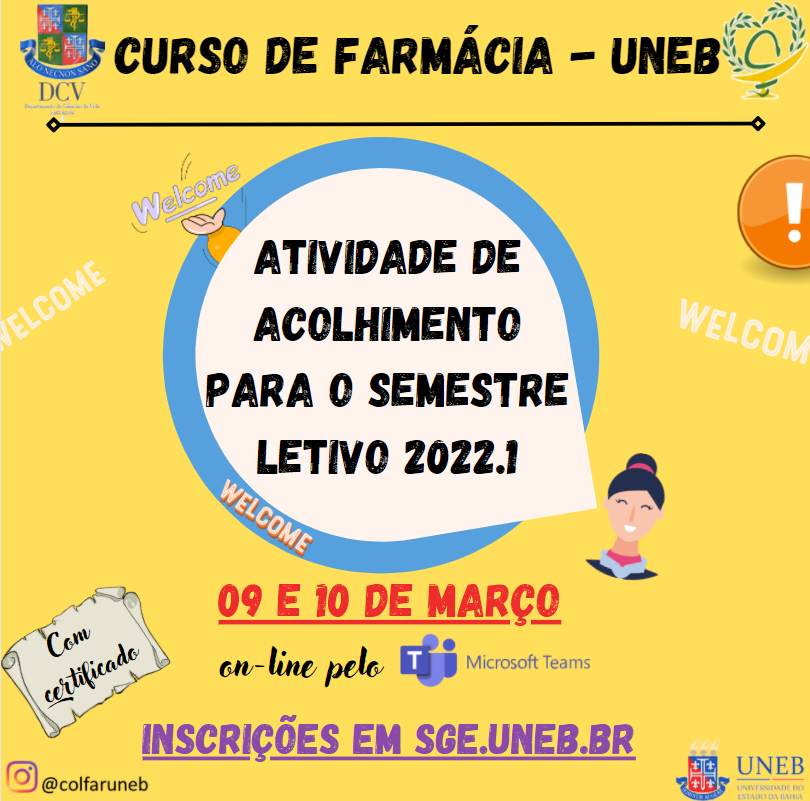 DCVI Inscrição - 02/03/2022 à 10/03/2022Convidamos a todxs, em especial nossxs calourxs do Curso de Farmácia, para uma atividade de acolhimento e boas-vindas nesse início do semestre letivo 2022.1. Nesse contexto pandêmico que ainda enfrentamos, a atuação do profissional farmacêutico passa por desafios que se renovam constantemente. Diante desse cenário, para além de recepcionar nossos queridos alunos para as atividades do semestre letivo 2022.1, convidamos Farmacêuticos de diversas áreas de atuação para relatar a sua experiência e desafios profissionais em tempos de pandemia pelo Covid-19. Não menos importante, teremos a completa apresentação do nosso Curso bem como do nosso Conselho Regional de Farmácia, além de contarmos com a participação do corpo docente que compõe o Colegiado do nosso Curso de Farmácia. Esperamos que aproveitem e desejamos um excelente 2022.1 a todxs. ATENÇÂO: - O link da transmissão da atividade será disponibilizado às 10:00h do dia 09/08 através da bio e do e-mail de todos os participantes inscritos na plataforma SGE.UNEB.BR. - O certificado será concedido para participantes inscritos no SGE.UNEB.BR e que atestarem presença no evento mediante formulário cujo link será disponibilizado no dia.