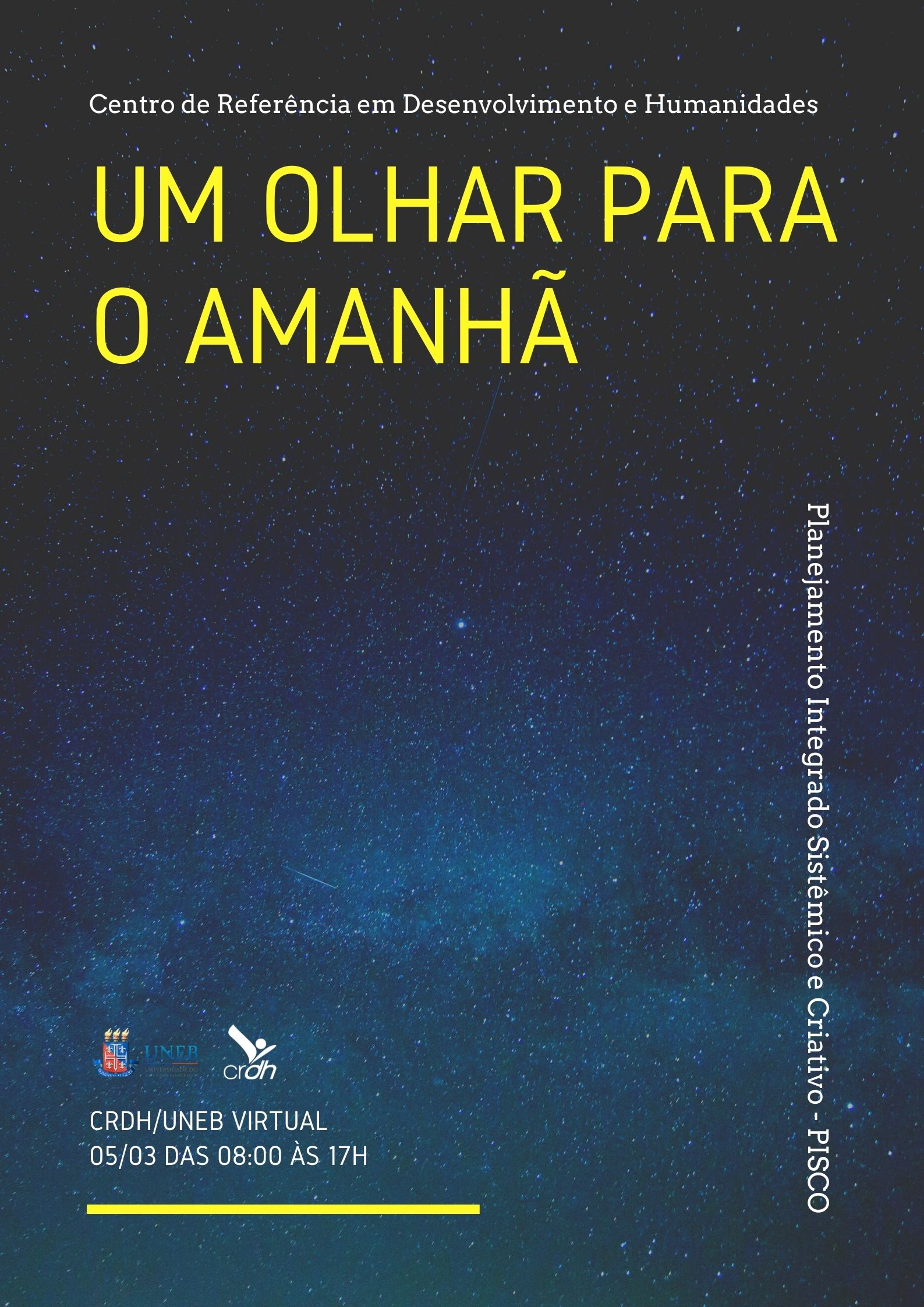 DCHTXIX Inscrição - 01/03/2022 à 05/03/2022O PLANEJAMENTO INTEGRADO SISTÊMICO E CRIATIVO (PISCO) do CENTRO DE REFERÊNCIA EM DESENVOLVIMENTO E HUMANIDADES da UNIVERSIDADE DO ESTADO DA BAHIA (CRDH/UNEB) é um seminário internacional, na modalidade híbrida, que visa definir as ações e projetos de pesquisa, extensão, ensino e inovação (social, pública e empresarial) para os anos de 2022 a 2030, com a elaboração de um Portfólio (Baía de Todos os Santos), que - depois de finalizado - será apresentado em uma sessão pública a toda a sociedade. Participam do evento pesquisadorxs do CRDH/UNEB, investigadores sociais, servidores públicos, lideranças populares, convidados e o público em geral. São referências para o planejamento: As Portarias conjuntas 074/2021 e 001/2022 da UNEB/SECTI para criação do Instituto de Tecnologia Social. A IV Conferência de Ciência, Tecnologia e Inovação do Estado da Bahia - Bahia Sociedade 5.0 - Formação de pessoas para a Sociedade 5.0; Os 17 Objetivos do Desenvolvimento sustentável. Se for de paz, pode entrar!