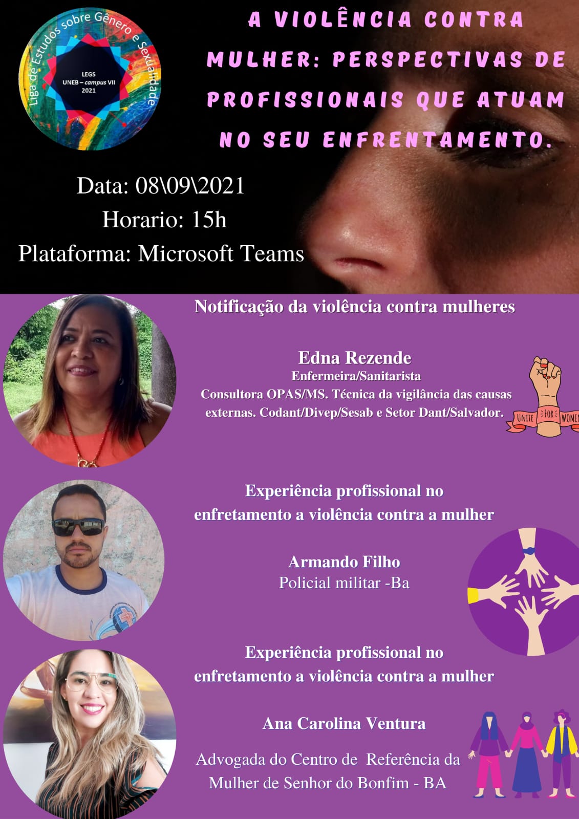 DEDCVII Inscrição - 01/09/2021 à 08/09/2021Encontro aberto da Liga de Estudos sobre Gênero e Sexualidade (LEGS/UNEB campus VII) a ser realizado dia 08 de setembro de 2021. O tema para o encontro será "A violência contra mulher: perspectivas de profissionais que atuam no seu enfrentamento". Contaremos com a presença de três pessoas convidadas: Edna Resende - Enfermeira, sanitarista, consultora da OPAS/MS, técnica da vigilância das causas externas, CODANT/DIVEP/SESAB/Setor DANT/Salvador. Abordará aspectos sobre a notificação da violência contra as mulheres. Armando Filho - Policial militar-BA. Abordará sobre sua experiência no enfrentamento da violência contra as mulheres. Ana Caroline Ventura - Advogada do Centro de Referência da Mulher de Senhor do Bonfim, Bahia. Abordará sobre sua experiência no enfrentamento da violência contra as mulheres. Nossos encontros abertos são direcionados para toda comunidade. Contamos com a sua presença.