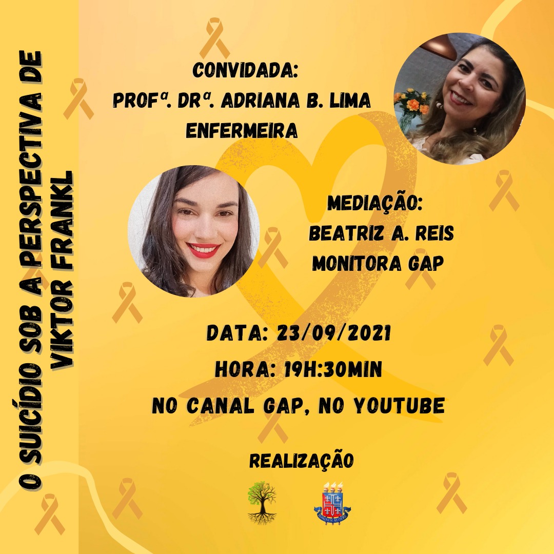 DEDCVII Inscrição - 01/09/2021 à 23/09/2021Live promovida pelo Grupo de Apoio ao Familiar da Criança em UTI Pediátrica - GAP, que abordará o tema "O suicídio sobre a perspectiva de Viktor Frankl" em comemoração ao Setembro Amarelo, mês destinado a prevenção do suicídio.