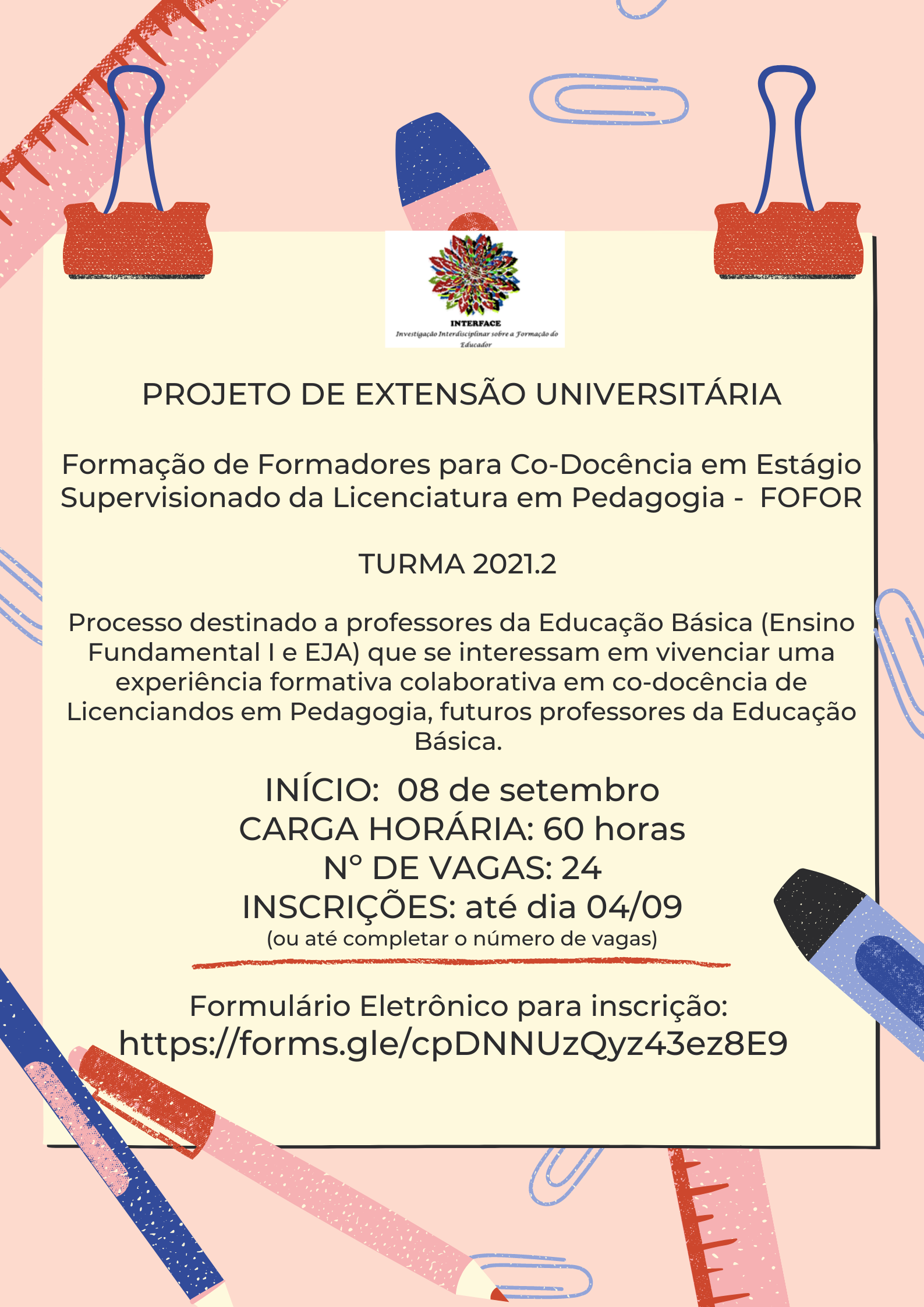 NUPE DEDC I Inscrição - 02/09/2021 à 04/09/2021O projeto Formação de Formadores para Co-docência em Estágio Supervisionado da Licenciatura em Pedagogia - FOFOR traz a Proposta Acadêmica de Formação Extensionista de Aperfeiçoamento Docente delineada pelo Grupo de Pesquisa Interface: Investigação Interdisciplinar sobre a Formação do Educador, lastreada por uma pesquisa formação Co-formação Docente: Educação Básica e Universidade construindo trilhas de aprendizagens profissionais com estudantes de Pedagogia/UNEB. Esta proposta de aperfeiçoamento profissional refere-se a processos co-formativos da docência e está sendo desenvolvida para professores da educação básica que se interessam pela formação das novas gerações de professores. O propósito desta experiência formativa consiste em articular Ensino/Pesquisa/Extensão, considerando que os participantes, docentes da educação básica e universidade, vinculados a grupos de pesquisa do DEDC I, em parceria com o Grupo de Pesquisa INTERFACE, e tem como tônus a investigação da aprendizagem das práticas profissionais da docência. Link da Inscrição: https://forms.gle/xgg4VVEyrv2jMUsK9