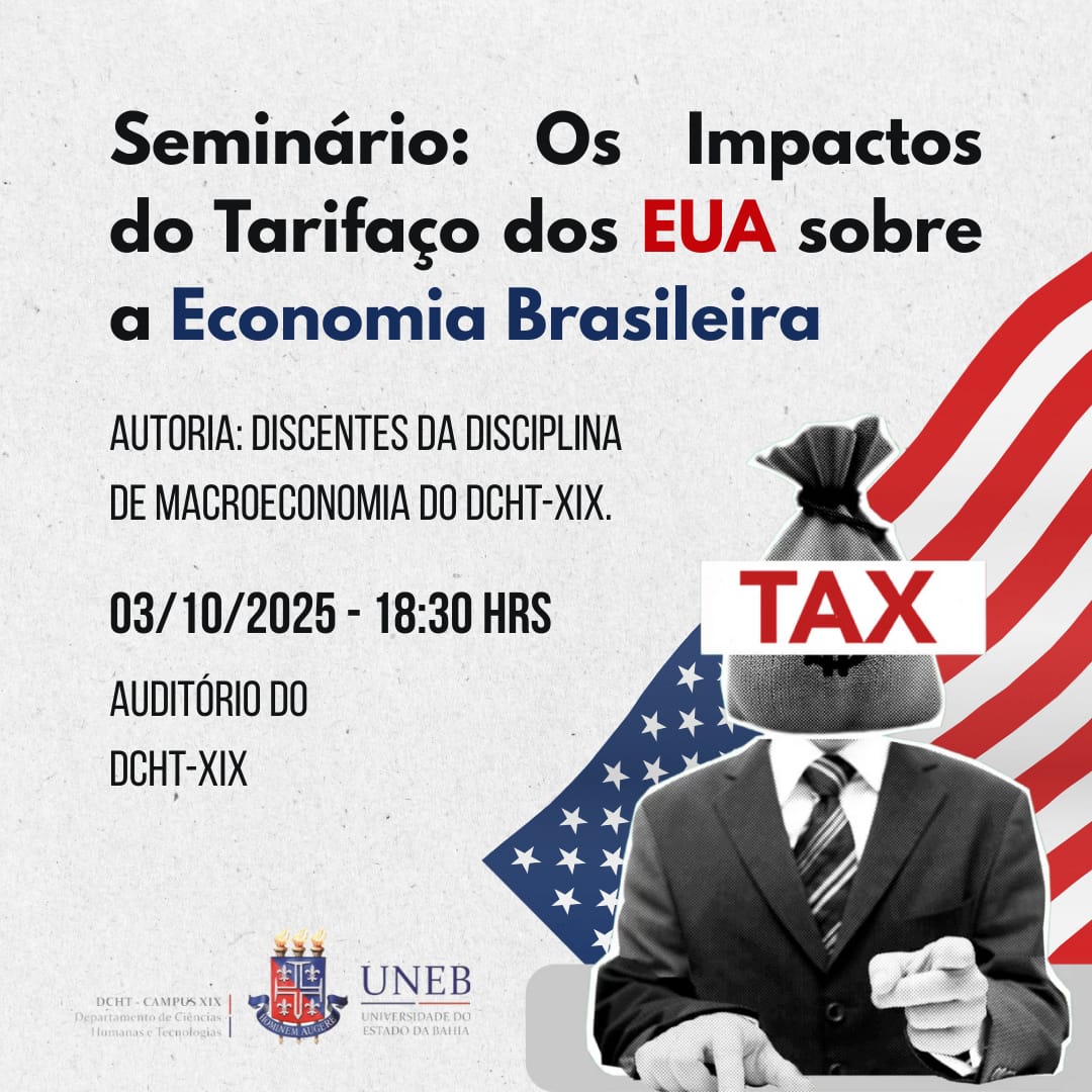 DCHTXIX Inscrição - 23/09/2025 à 03/10/2025OS IMPACTOS DO TARIFAÇO DOS EUA SOBRE A ECONOMIA BRASILEIRA, SEGMENTOS PRODUTIVOS SELECIONADOS Seminário de pesquisa dos estudantes matriculadas/os na disciplina de MACROECONOMIA, no semestre 2025.2, sob a orientação da Profa. Dra. Josete Ribeiro.