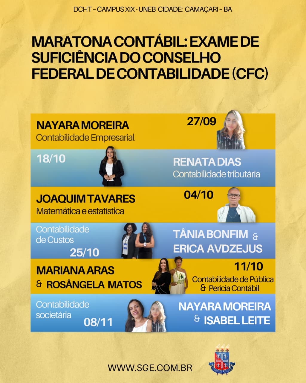 DCHTXIX Inscrição - 23/09/2025 à 07/11/2025A Maratona Contábil da UNEB - Campus XIX Camaçari ocorrerá no período de 27/09/2025 até 08/11/2025 e tem como objetivo preparar os estudantes que irão realizar o Exame de Suficiência do Conselho Federal de Contabilidade (CFC).