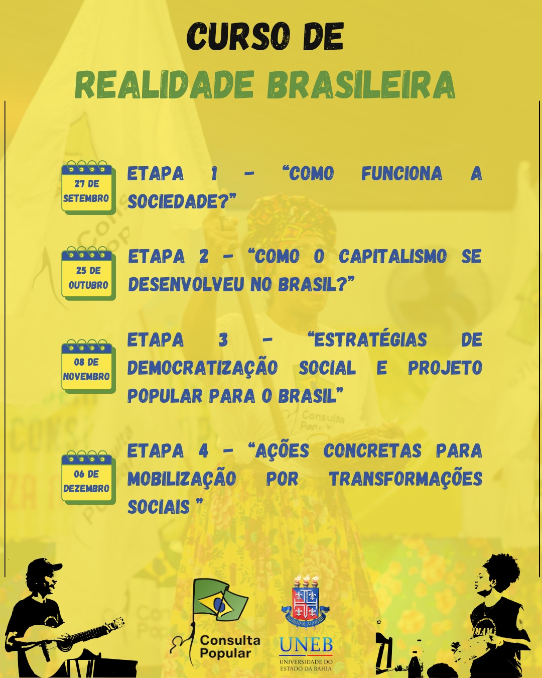 DEDCXII Inscrição - 24/09/2025 à 18/11/2025O presente curso tem como objetivo promover a formação política de estudantes, servidores públicos, agentes de cultura e membros de coletivos e movimentos sociais sobre temas relevantes para compreensão da sociedade brasileira, bem como para produzir reflexões no sentido da transformação da sociedade. O curso vai ocorrer em 4 módulos de 4h de duração, um sábado ao mês, nos meses de setembro, outubro, novembro e dezembro. Será trabalhada a metodologia da Educação Popular, com a participação de todos, entre educandos/as e educadores/as, na construção do conhecimento, com uso de recursos como quadro, cartolina, projetor, fotografias, entre outras. Os temas serão divididos em um primeiro módulo conceitual sobre o funcionamento da sociedade, seguido de discussão sobre como o capitalismo se desenvolveu no Brasil no segundo módulo, estudo de estratégias de transformação social no terceiro módulo, e encerramento com a reflexão sobre trabalho de organização e mobilização social. O curso será realizado em módulos de 4h de duração, com indicação de leituras prévias para a turma, que deverão auxiliar as discussões nos encontros. A exposição de conteúdo se dará através de metodologia da Educação Popular, com o envolvimento de todos e todas na construção do conhecimento, através de dinâmicas e trabalhos em grupo, utilizando de recursos como cartolina, quadro, projetor, fotografias entre outros. Ao fim de cada módulo será destinado tempo para avaliação dos encontros e combinados para o módulo seguinte. Programação: : * 27/09 Manhã: Como Funciona a Sociedade? Palestrantes convidados: Venício da Silva Montalvão, Bacharel em Direito pela UNIFG – BA e integrante da Consulta Popular; Cássia Cotrim, Graduada em Arte com habilitação em Música pela Unimontes, Especialista em Metodologia do ensino das Artes pela Funorte e mestra em Música área de concentração Educação Musical pela UFRGS e integrante da Consulta Popular. * 25/10 Manhã: Como capitalismo se desenvolveu no Brasil? Palestrantes convidados: Simone Jesus Silva, Graduanda em Pedagogia pela UNEB Campus XII e integrante da Consulta Popular. Beniézio Eduardo Carvalho, Graduado em Administração pela UNEB Campus XII e Especialista em Desenvolvimento Territorial na América Larina pela UNESP/ENFF e integrante da Consulta Popular. *08/11 Manhã: Estratégias de democratização social e Projeto Popular para o Brasil Palestrantes convidados: Venício da Silva Montalvão, Bacharel em Direito pela UNIFG – BA e integrante da Consulta Popular; Cássia Cotrim, Graduada em Arte com habilitação em Música pela Unimontes, Especialista em Metodologia do ensino das Artes pela Funorte e mestra em Música área de concentração Educação Musical pela UFRGS e integrante da Consulta Popular. 06/12 Manhã: Ações concretas para mobilização por transformações sociais Palestrantes convidados: Simone Jesus Silva, Graduanda em Pedagogia pela UNEB Campus XII e integrante da Consulta Popular