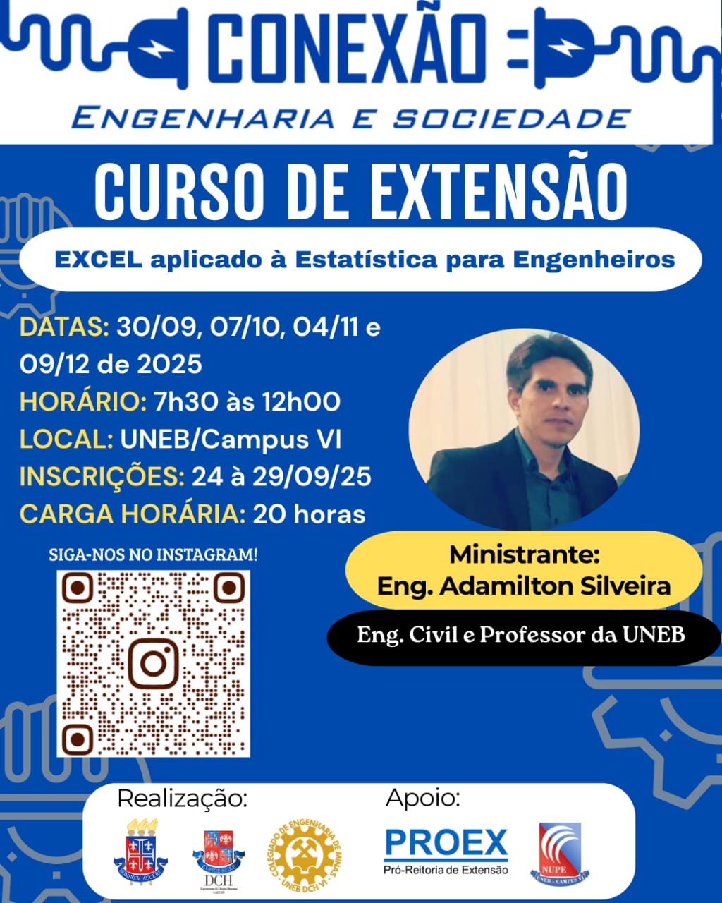 DCHVI Inscrição - 25/09/2025 à 30/09/2025O curso de extensão “Excel aplicado à Estatística para Engenheiros” é promovido pelo projeto de extensão “Conexão: Engenharia e Sociedade”, coordenado pelo Professor Adamilton Novais Silveira, com o apoio do colegiado de Engenharia de Minas da UNEB/Campus VI. O evento visa oferecer um curso de extensão em Excel aplicado à Estatística para Engenheiros com carga horária de 20 horas. O curso será ministrado pelo Eng. Adamilton Novais Silveira, Bacharel em Engenharia Civil pela UFRB e professor da UNEB, que abordará os fundamentos do Excel aplicado à Estatística para Engenheiros. Público Alvo: estudantes e profissionais da área de Engenharia de Minas, Geologia, Biologia, Geografia e demais interessados