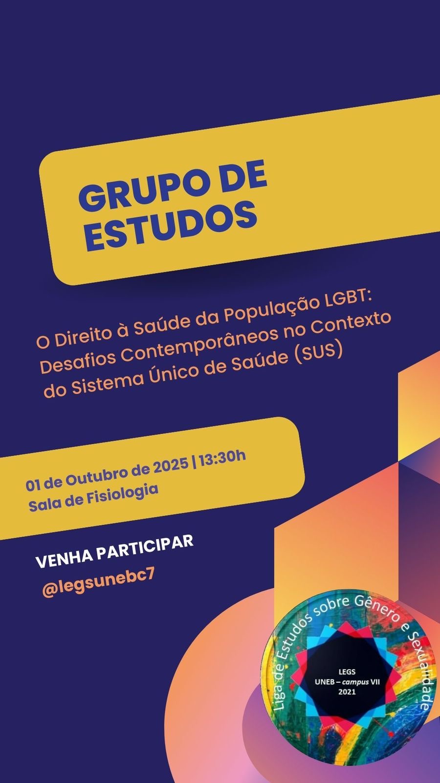 DEDCVII Inscrição - 26/09/2025 à 01/10/2025Dia 01 de outubro de 2025 ocorrerá o grupo de estudos da LEGS. Utilizaremos como base para o diálogo o texto: "O Direito à Saúde da População LGBT: Desafios Contemporâneos no Contexto do Sistema Único de Saúde (SUS)". Horário: 13h30 Local: Laboratório de fisiologia na UNEB campus VII Link do texto: https://pssaucdb.emnuvens.com.br/pssa/article/view/1047 PARTICIPE!