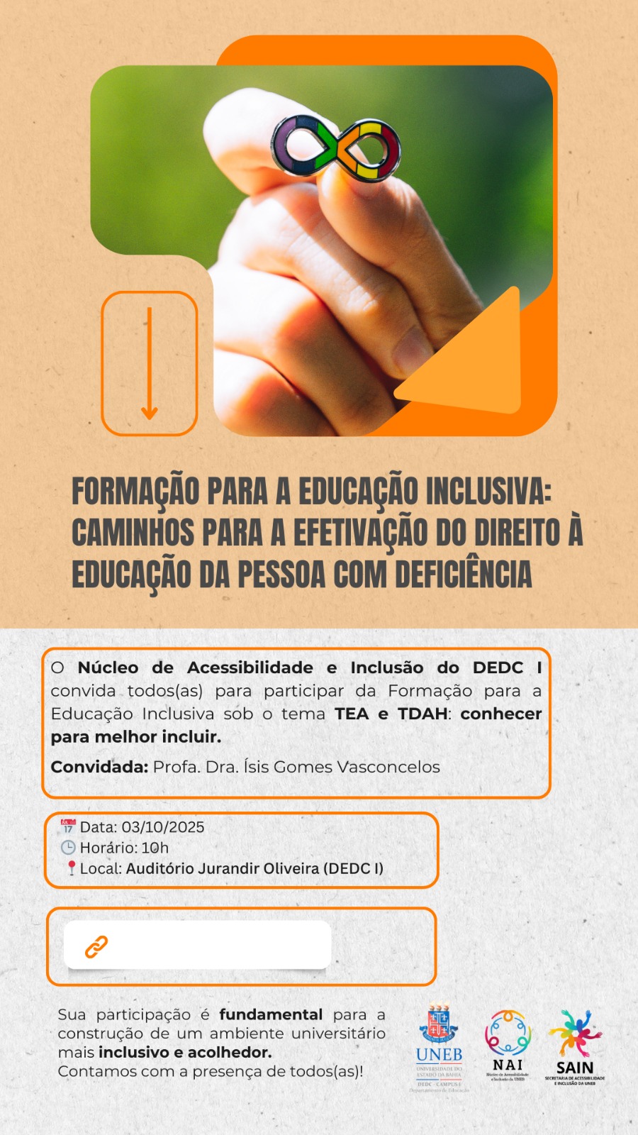 DEDCI Inscrição - 26/09/2025 à 03/10/2025"Formação para a Educação Inclusiva: Caminhos para a Efetivação do Direito à Educação da Pessoa com Deficiência" no nosso Departamento, no SGE, para divulgação das Inscrições. Informações a serem atualizadas: O Núcleo de Acessibilidade e Inclusão do DEDC I convida todos(as) para participar da Formação para a Educação Inclusiva sob o tema TEA e TDAH: conhecer para melhor incluir. Convidada: Profa. Dra. Ísis Gomes Vasconcelos O Encontro tem como objetivo contribuir diretamente para a efetivação da política de acessibilidade na UNEB, garantindo que o ambiente acadêmico seja cada vez mais acessível, respeitoso e acolhedor. Informações: Data: 03/10/2025 Horário: 10h Local: Auditório Jurandir Oliveira (DEDC I).