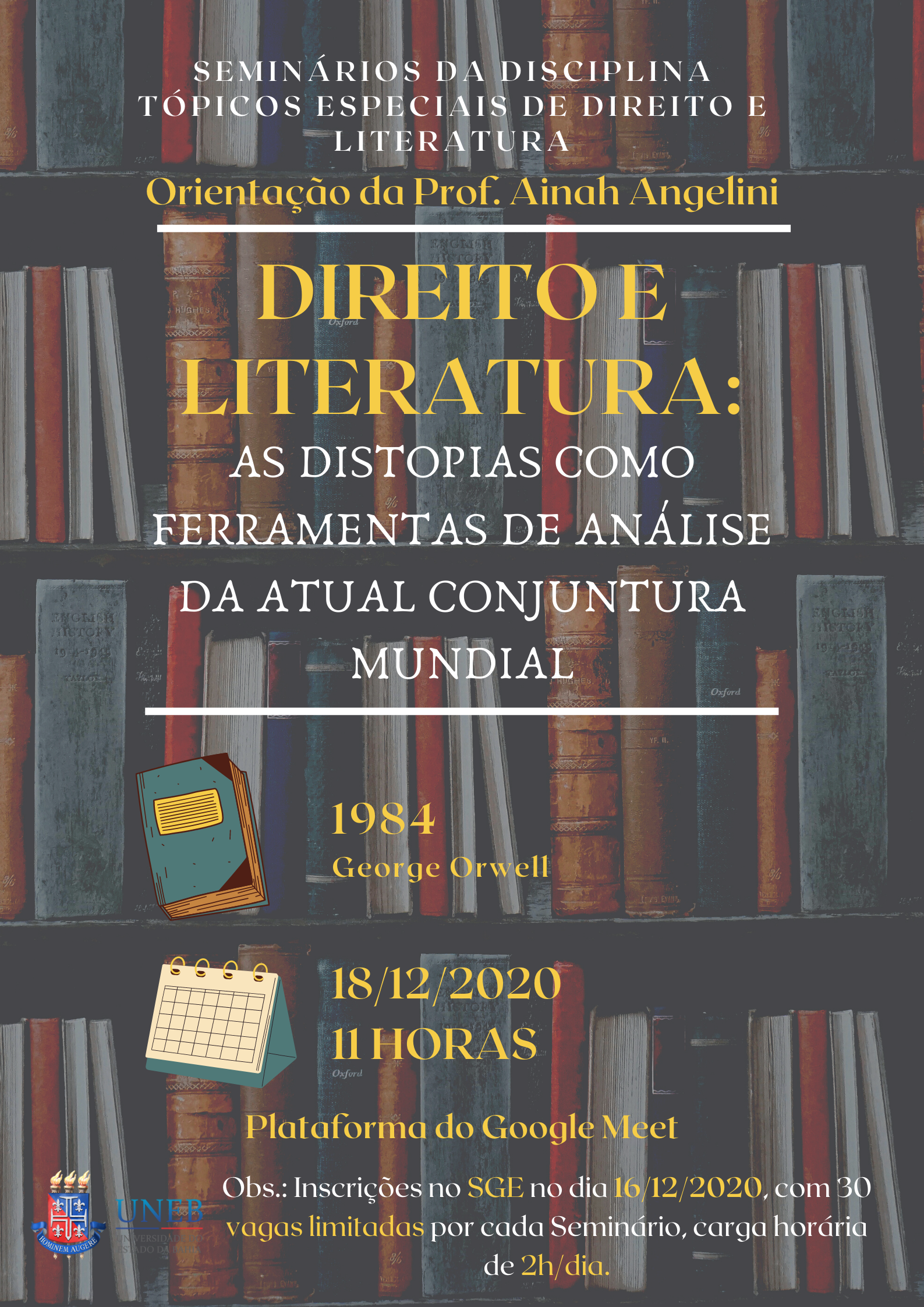DCHI Inscrição - 16/12/2020 à 17/12/2020Seminários de conclusão da disciplina Tópicos Especiais de Direito e Literatura, com apresentação, por parte dos alunos, de obras distópicas correlacionadas com a disciplina estudada. Obra tratada no dia: 1984, de George Orwell.