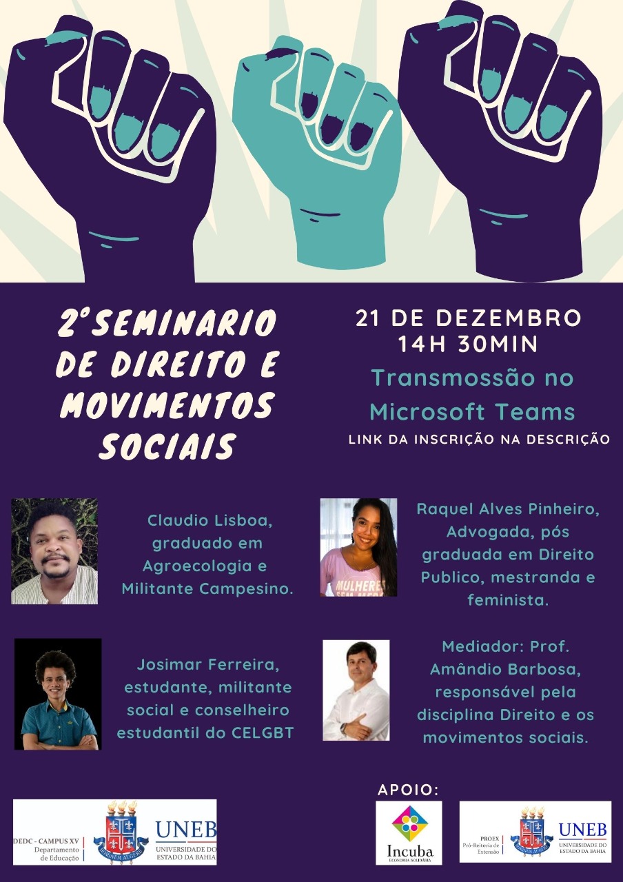 DEDC-XV Inscrição - 17/12/2020 à 21/12/2020CONVITE. INSCRIÇÕES ABERTAS. A Universidade do Estado da Bahia (UNEB), Departamento de Educação de Educação, Campus XV, juntamente com os discentes da componente curricular "Direito e os Movimentos Sociais" convida toda a comunidade para participar do II Seminário de Direito e Movimentos Sociais em formato de mediação tecnológica. O evento acontecerá no dia 21 de dezembro de 2020, a partir das 14h30, com transmissão pelo Microsoft Teams. Para participar do evento, você deverá se inscrever primeiro, ingressando no link disponibilizado neste texto-convite. O evento conta com certificado de participação. As vagas são limitadas. Após a confirmação de inscrição no evento, enviaremos o link do Microsoft Teams, por e-mail, para acompanhar o nosso evento, em tempo real. O evento terá a participação do Professor Leonardo Fiusa, docente da Universidade do Estado da Bahia (UNEB) e coordenador do Grupo de Assessoria Jurídica e Popular (GAJUP). Contará com a participação da Dra. Raquel Alves Pinheiro, advogada, pós-graduada em Direito Público, mestranda e feminista. Contará com a professora Camila Nascimento Queiroz Sobral, docente do curso de Direito da UNEB e coordenadora do Núcleo de Prática Jurídica (NPJ) da UNEB, Departamento de Educação, Campus XV. O Seminário de Direito e Movimentos Sociais, em sua segunda edição consecutiva, se justifica na medida em que aborda as matrizes teóricas dos movimentos sociais, modelos clássicos e contemporâneos e suas interfaces com o fenômeno jurídico, especialmente com o conceito de sujeitos coletivos de direito, poder normativo dos grupos sociais, ação coletiva. Reflete sobre experiências sociais de criação de novos direitos e novas formas de organização social da liberdade: os direitos humanos, o pluralismo jurídico, direito de resistência e desobediência civil. Caracteriza os modelos e experiências dos movimentos sociais norte-americano, europeu e latino-americano. Discute o paradigma filosófico-jurídico dos direitos humanos como eixo central para análise do direito e suas fontes no processo de construção da democracia e cidadania e da participação autônoma no espaço da decisão política. Analisa a sociedade a partir dos recortes de classe, gênero, raça e região em suas relações com a exclusão social e o direito.