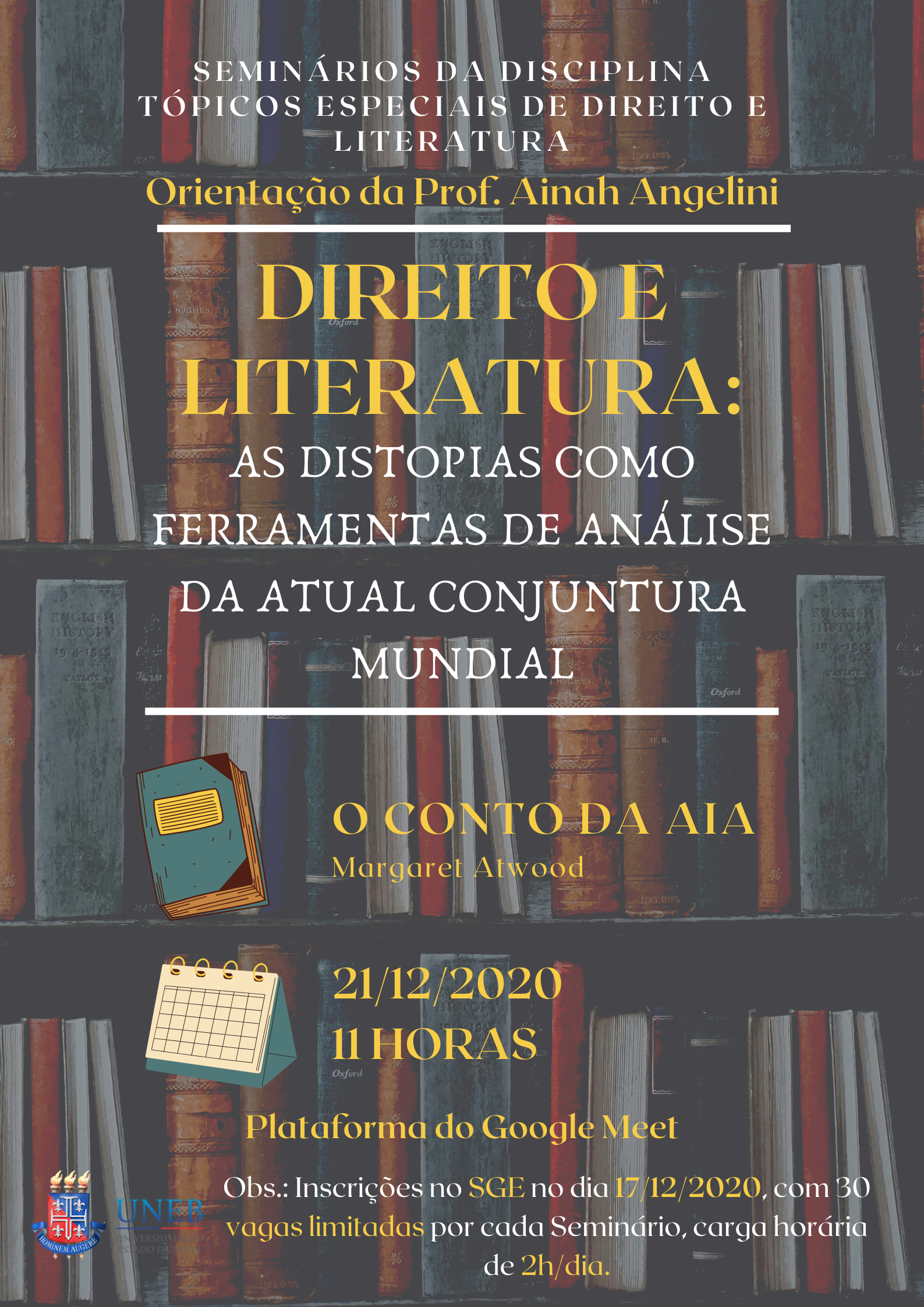 DCHI Inscrição - 18/12/2020 à 19/12/2020Seminários de conclusão da disciplina Tópicos Especiais de Direito e Literatura, com apresentação, por parte dos alunos, de obras distópicas correlacionadas com a disciplina estudada. Obra tratada no dia: O Conto da Aia, de Margaret Atwood.