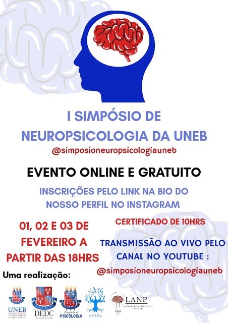 NUPE DEDC I Inscrição - 25/01/2021 à 31/01/2021I SIMPÓSIO DE NEUROPSICOLOGIA DA UNEB RESUMO: O evento “I Simpósio de Neuropsicologia da UNEB” tem como objetivo promover a discussão acerca das diversas nuances da Neuropsicologia, a partir das produções e crescimento da área no contexto atual. Para isso, o evento contará com a participação de profissionais que atuam com referenciais teóricos da regulação emocional, funções executivas, cognição social, dificuldades de aprendizado, neuropsicologia do desenvolvimento, neuropsicofarmacologia, saúde mental, entre outros. A partir dessas exposições, espera-se promover reflexões acerca da neuropsicologia na atuação e produção profissional. O evento tem como público alvo estudantes e profissionais de psicologia. OBJETIVO GERAL: Promover discussões e conhecimentos oriundos da Neuropsicologia para o público interno da UNEB, assim como para o público externo, através de palestras com especialistas na área. OBJETIVOS ESPECÍFICOS: - Promover espaços de discussões sobre os diferentes referenciais teóricos da Neuropsicologia - Compreender as especificidades dos diversos campos da Neuropsicologia; - Ampliar reflexões acerca da Neuropsicologia para a formação profissional e atuação neste campo. link do grupo do Whatsapp: https://chat.whatsapp.com/CVijg6PMk5L9PEfs078tJg