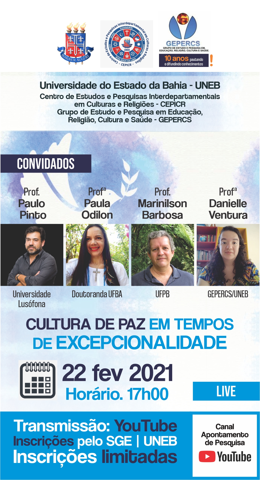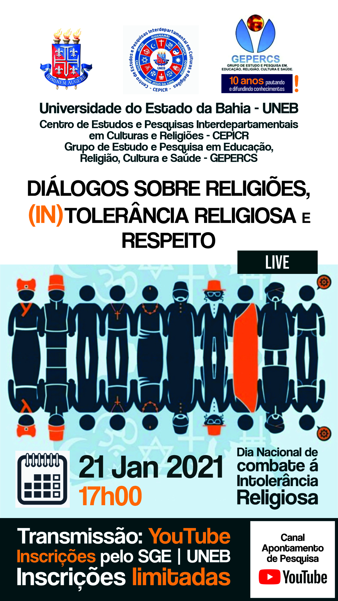 DEDC-XV Inscrição - 14/01/2021 à 21/01/2021UNIVERSIDADE DO ESTADO DA BAHIA - UNEB CENTRO DE ESTUDOS E PESQUISAS INTERDEPARTAMENTAIS EM CULTURAS E RELIGIÕES - CEPICR GRUPO DE ESTUDO E PESQUISA EM EDUCAÇÃO, RELIGIÃO, CULTURA E SAÚDE - GEPERCS DIÁLOGOS SOBRE RELIGIÕES, (IN)TOLERÂNCIA E RESPEITO CONVITE. nº 01/2021. A Universidade do Estado da Bahia (UNEB), através do Centro de Estudos e Pesquisas Interdepartamentais em Culturas e Religiões (CEPICR) e do Grupo de Estudo e Pesquisa em Educação, Religião, Cultura e Saúde (GEPERCS) convida toda comunidade para participar do evento acadêmico Diálogos sobre Religiões, (In)tolerância e Respeito em formato de mediação tecnológica, com transmissão pelo Canal Apontamento de Pesquisa, no YouTube. O evento acontecerá no dia 21 de janeiro de 2020, a partir das 17h00. O evento se justifica na medida em que se insere num conjunto de discussões acadêmicas necessárias em torno do *Dia Nacional de Combate à intolerância,* que acontece no dia 21 de janeiro, por meio da promulgação da Lei nº 11.635/2007. Com o crescimento da diversidade religiosa no Brasil observa-se um aumento das manifestações públicas, tanto em meio físico como em redes sociais, contra a liberdade religiosa. A intolerância religiosa promove atos de discriminação, agressão e ofensa a religiões, liturgias e cultos incidindo no não-reconhecimento das crenças do outro. O objetivo deste evento é discutir os limites entre a relação a liberdade de expressão e a liberdade de crença em Divindades. Para participar do evento pelo YouTube, você deverá se inscrever no site do Sistema de Gerenciamento de Eventos (SGE) da Universidade do Estado da Bahia (UNEB), ingressando no link disponibilizado neste texto-convite. O evento conta com certificado de participação expedido pela própria instituição. Para ter direito ao certificado, o participante inscrito deverá preencher o formulário de frequência, disponibilizado pelos monitores no dia do evento. Contamos com a sua presença!