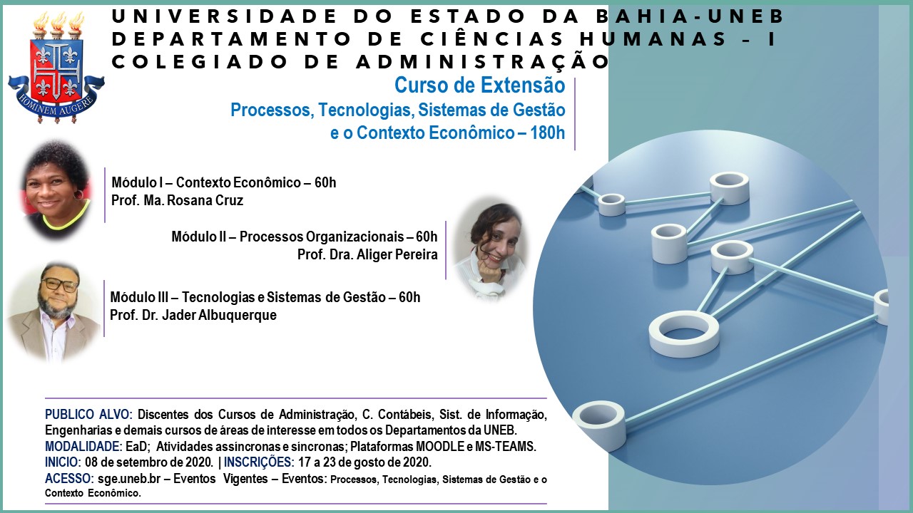 NUPE DCH I Inscrição - 07/09/2020 à 10/09/2020DEPARTAMENTO DE CIÊNCIAS HUMANAS - DCH I COLEGIADO DE ADMINISTRAÇÃO CURSO DE EXTENSÃO PROCESSOS, TECNOLOGIAS, SISTEMAS DE GESTÃO E O CONTEXTO ECONÔMICO Prezados (as), Devido ao encerramento das inscrições para participação no Curso de Extensão Processos, Tecnologias, Sistemas de Gestão e o Contexto Econômico e a procura ainda por vagas, a coordenação informa que infelizmente não existem vagas. Entretanto, caso aconteça desistência de inscritos na primeira semana do curso, estaremos disponibilizando vagas residuais que vierem ocorrer. Inscrevam-se durante o período de 07/09/2020 a 10/09/2020 na lista de espera para caso ocorram vagas. A convocação para utilização dessas vagas será realizada por ordem de inscrição. Caso tenham interesse, estejam atentos! Coordenação do Curso ========================================================================================================================================= Trata-se de atividade extensionista que tem como público alvo a comunidade externa e interna da Universidade (preferencialmente) da área de Administração, Ciências Contábeis e áreas afins. Será na modalidade a distância com o uso das ferramentas disponibilizadas nos ambientes virtuais de aprendizagem MS-TEAMS e MOODLE (ferramentas institucionais disponibilizadas pela UNEAD – no Ambiente Virtual de Aprendizagem). O objetivo é ampliar conteúdos formadores de conhecimentos na área de gestão, conteúdos nas áreas de macroeconomia, organização sistemas e métodos, administração de sistemas de informação, conforme ementa do curso de Administração e possibilitar atividades complementares de curso. Terá abordagem interdisciplinar das temáticas em pauta. A certificação será estabelecida para cada módulo concluído pelo cursista. As disciplinas serão oferecidas em 3 Módulos. Modulo I - Contexto Econômico (60 hs); Modulo II - Processos Organizacionais (60 hs); e Modulo III- Tecnologias e Sistemas de Gestão (60 hs). Total: 180 horas Distribuição da Carga Horária por cada Módulo :51 hs assíncronas e 9 hs síncronas (, totalizando 60 hs para cada Módulo. TÍTULO DO CURSO: Processos, Tecnologias, Sistemas de Gestão e o Contexto Econômico COORDENADOR (ES): Rosana Cruz Marques da Silva (responsável) Aliger dos Santos Pereira e Jader Cristiano Magalhães de Albuquerque PÚBLICO ALVO: alunos do curso de Administração, Ciências Contábeis e a comunidade externa e interna (da Universidade) INICIO DA INSCRIÇÃO: 17/08/2020 TÉRMINO DA INSCRIÇÃO: 23/08/2020 INÍCIO DO CURSO: 08/09/2020 NÚMERO DE VAGAS: 100 + 50 +50 CARGA HORÁRIA: 180 hs NOTA: 1- As aulas síncronas serão ministradas às terças e quintas a noite e quartas pela manhã, em horário a ser combinado após o início das aulas. 2 - Devido a grande procura pelo curso, foram acrescentadas mais 50 vagas ampliando a oferta para 200.