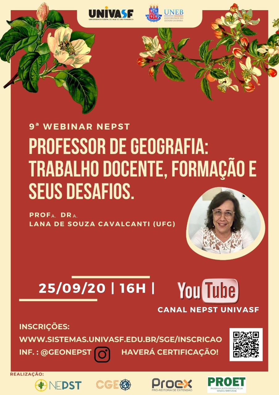 A Universidade Federal do Vale do São Francisco (UNIVASF) e a Universidade do Estado da Bahia (UNEB), por meio do Núcleo de Estudos das Paisagens Semiáridas Tropicais (NEPST), vêm respeitosamente solicitar a V.Sa. a divulgação da 9ª Webinar – Professor de Geografia: Trabalho docente, formação e seus desafios, ministrada pela Profa. Dra. Lana de Souza Cavalcanti (UFG) que se realizará no dia 25 de setembro de 2020 às 16h00min. A 9ª Webinar do NEPST visa a promover o aperfeiçoamento das comunidades acadêmica e externa a fim de mantê-las atualizadas nas questões inerentes à pandemia da COVID-19, considerando o contexto de distanciamento social. Esta iniciativa representa compromisso social da UNIVASF (Campus Senhor do Bonfim) e da UNEB (Campi I e IV) no que se refere à valorização profissional mediante cursos de formação continuada. Ressaltamos que esta atividade de extensão é gratuita e será expedido certificado de participação aos ouvintes. Os interessados deverão se inscrever no 9ª Webinar NEPST - 25/09/20 no endereço eletrônico: