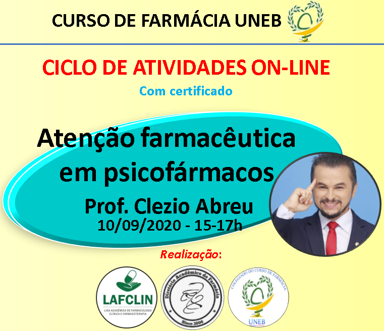 DCVI Inscrição - 08/09/2020 à 10/09/2020Prezados alunos do curso de Farmácia da UNEB e demais interessados, Para promover o conhecimento durante a suspensão das atividades presenciais devido a pandemia, a Coordenação do Colegiado, o Diretório Acadêmico e a Ligas Acadêmicas do curso de Farmácia estão se articulando para promover atividades on-line, com direito a certificação. Nessa semana, contamos com o apoio da Liga Acadêmica de Farmacologia Clínica e Farmacoterapia (LAFCLIN) para promover a seguinte atividade: > 10/09 - 15 às 17h - Palestra " Atenção farmacêutica em psicofármacos" - Profa. Clezio Abreu Importante: - Alunos de qualquer instituição/curso podem se participar; - Inscrições de cada palestra se encerrarão 6 horas antes da sua realização, ou quando se esgotarem as vagas (200); - Atividades ocorrerão pelo MICROSOFT TEAMS, cujo link de acesso será enviado por e-mail com 3 horas de antecedência do início da palestra; - Os dados de e-mail dos inscritos serão também utilizados pela instituição parceira ICTQ exclusivamente para veicular opções de cursos de pós-graduação; - Vagas serão prioritárias a alunos do curso de Farmácia da UNEB; - Concessão do certificado será condicionada ao rendimento de 60% (ou maior) em rápida avaliação on-line, aplicada ao final da atividade; Dúvidas e atualizações, acompanhe as constas do Instagram -- >> @colfaruneb e @dafaruneb e @lafclin #sepuderficaemcasa