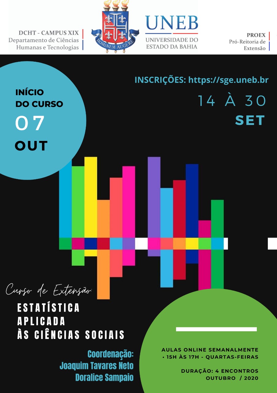 DCHTXIX Inscrição - 14/09/2020 à 30/10/2020A realização do Curso de Extensão “Estatística Aplicada às Ciências Sociais” para discentes da UNEB e comunidade em geral tem como foco contribuir para o desenvolvimento de estratégias e ações que possibilitem aos alunos uma adequada análise e interpretação de gráficos e tabelas, auxiliando-os na compreensão de questões atuais, oferecendo à sua vida melhores propostas de encaminhamento. Desta forma, desejamos fornecer procedimentos que possibilitem ao alunos coletar, organizar e sintetizar levantamentos, comparar e analisar dados para defender ideias, bem como pesquisar e comunicar dados estatísticos das pesquisas através de tabelas e gráficos, interpretando as representações gráficas que aparecem frequentemente no dia-a-dia. Gráficos relacionados a diferentes disciplinas escolares auxiliam na obtenção de conhecimentos para uma formação de conceitos, contribuindo para o estímulo à leitura crítica e reflexiva das informações sociais, políticas e econômicas divulgadas em linguagem gráfica.