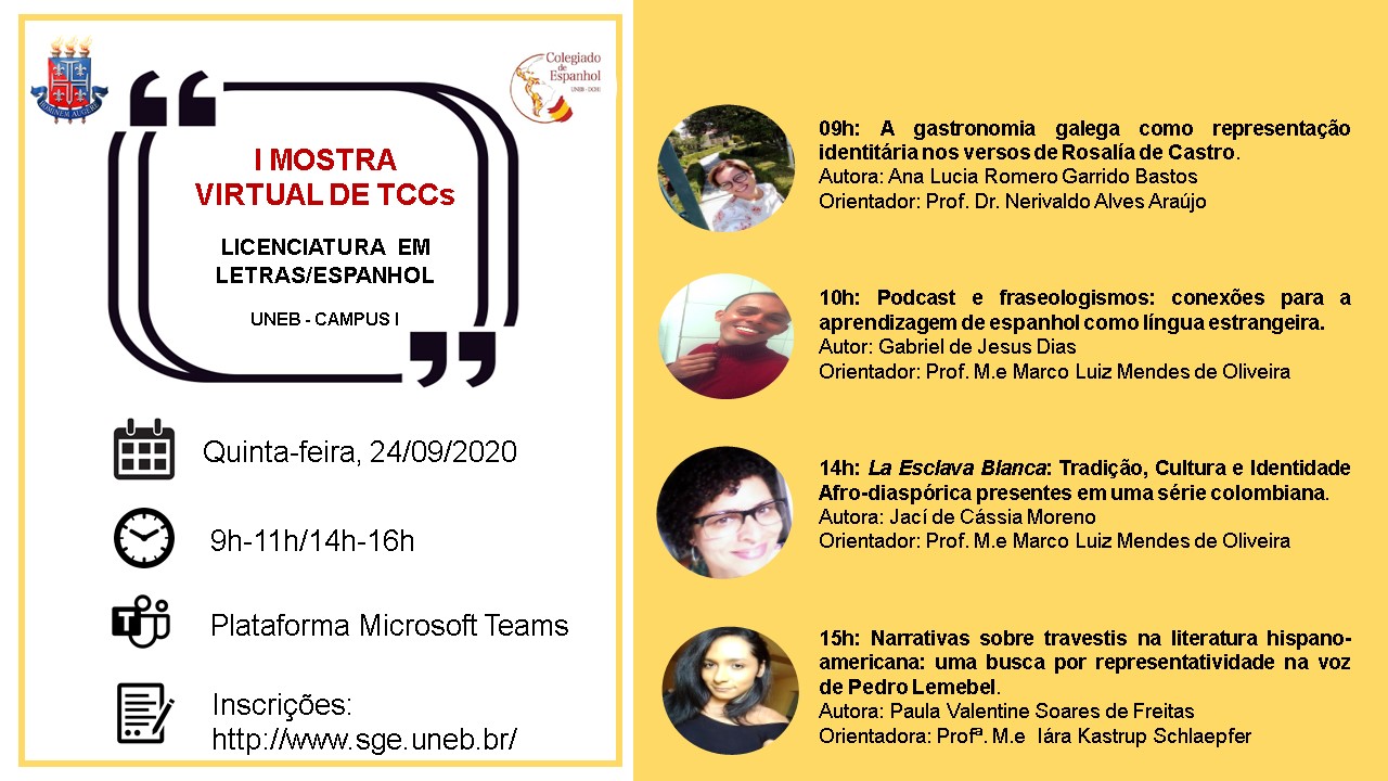 NUPE DCH I Inscrição - 18/09/2020 à 23/09/2020O projeto de extensão intitulado “Socialização de Monografias de Conclusão de Curso - Letras Espanhol” tem como objetivo desenvolver a socialização de monografias de trabalho de conclusão de curso (TCC), do semestre 2019.2, do Curso de Licenciatura em Letras - Língua Espanhola e Literaturas da UNEB(Campus I) que não foram defendidas presencialmente por conta da pandemia de COVID-19. No intuito de proporcionar o acesso a esses trabalhos acadêmicos, este projeto visa a estabelecer uma interlocução entre a produção de conhecimento na UNEB e a comunidade externa. O evento será realizado no dia 24 de setembro de 2020, coordenado pelos professores Me. Marco Luiz Mendes de Oliveira e Dr. Nerivaldo Alves Araújo, de forma remota pela plataforma Microsoft Team, mediando as discussões sobre os temas abordados nas monografias de TCC.