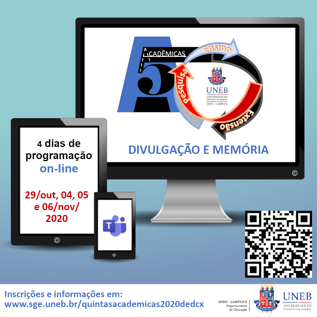 DEDCX Inscrição - 10/09/2020 à 06/11/2020O projeto “Quintas Acadêmicas: divulgação e memória” foi concebido em uma reunião do Núcleo de Pesquisa e Extensão - NUPEX - Departamento de Educação, Campus X - da Universidade do Estado da Bahia - UNEB, cuja participação envolve docentes e discentes. Garantir a divulgação dos conhecimentos produzidos pela comunidade acadêmica, bem como o registro, a organização e a preservação da memória acadêmica do Departamento de Educação - Campus X se constituem objetivos norteadores desse Projeto. Desde o ano de 2005, o “Quintas Acadêmicas: divulgação e memória” vem se constituindo em um espaço de socialização e discussão, de modo a favorecer a indissociabilidade entre os três pilares da Universidade - ensino, pesquisa e extensão. As atividades propostas estão pautadas no princípio de que a Universidade é um espaço privilegiado de produção do saber, de modo que se torna imprescindível que o conhecimento, nela produzido, seja socializado a toda comunidade acadêmica e externa. Esperamos que essa prática possa continuar contribuindo no processo de formação dos discentes e docentes do Campus X, uma vez que o entrelaçamento entre ensino, pesquisa e extensão favorece reflexões mais consistentes sobre o fazer pedagógico, promovendo melhores condições para o desempenho do ofício de professor. Devido ao atual contexto da pandemia do COVID-19, a decima edição do Projeto será realizada online. PROGRAMAÇÃO DATA ATIVIDADE 29/10/2020 19h às 21h Transmissão através do Canal UNEB Campus X no YouTube Atividade Cultural Mediadora: Gislaine Romana Carvalho da Silva (Licenciatura em Música) Cerimônia de Abertura Participantes: Direção, NUPEX e Coordenação do Quintas Mediadora: Kildria Vieira Alves Gigante Mesa Redonda Tema: O princípio da indissociabilidade entre ensino, pesquisa e extensão no Ensino Superior Participantes: Pró-Reitorias da UNEB - PPG, PROEX e PROGRAD Mediadora: Minervina Joseli Espíndola Reis 04/11/2020 14h30min às 16h30min Transmissão através da Plataforma Microsoft Teams UNEB Comunicação Oral 19h às 21h Transmissão através da Plataforma Microsoft Teams UNEB Comunicação Oral 05/11/2020 14h30min às 16h30min Transmissão através da Plataforma Microsoft Teams UNEB Comunicação Oral 19h às 20h30min Transmissão através do Canal UNEB Campus X no YouTube Lançamento de Livros de autores do Campus X Mediadora: Ana Odália Veira Sena 06/11/2020 19h às 21h Transmissão através do Canal UNEB Campus X no YouTube Atividade Cultural Mediador: Gean Paulo Gonçalves Santana Mesa Redonda Tema: O princípio da indissociabilidade entre ensino, pesquisa e extensão no Ensino Superior: narrativas de egressos do Campus X Participantes: Clóvis Lisboa dos Santos Júnior, Grégory Alves Dionor, Igor José Sousa Mascarenhas e Karina Lima Sales Mediador: Clóvis Lisboa dos Santos Júnior Transmissão através do Canal UNEB Campus X no YouTube Endereço: https://www.youtube.com/channel/UCJgrB_TncriEmnDKxstOQXA INSCRIÇÕES Para efetuar a inscrição no evento, o participante deverá preencher o formulário de inscrição no site do evento: www.sge.uneb.br/quintasacademicas2020dedcx. INSTRUÇÕES PARA SUBMISSÃO DE TRABALHOS Os Trabalhos Científicos submetidos na X edição do "Quintas Acadêmicas: divulgação e memória" devem ser enviados em formato de Resumo Expandido e serão apresentados na forma de Comunicação Oral, enquadrando-se em uma das seguintes categorias: ensino (Pibid, Monitoria, Estágio, Residência Pedagógica), pesquisa (Iniciação Científica, Trabalhos de Conclusão de Curso de Graduação e Pós-graduação), extensão (Projetos Programas, Monitoria). Serão aceitos para avaliação trabalhos com, no máximo, quatro autor(es) e/ou coautor(es). Um autor poderá inscrever até dois trabalhos como autor principal e sem limites para coautoria. O professor orientador deverá realizar a submissão do trabalho no evento. Para tanto, deverá preencher o formulário de submissão de trabalhos e enviar o trabalho para o e-mail trabalhosquintasacademicas@gmail.com. Observações: Para participar do evento não é obrigatória a inscrição de trabalhos. Pode-se participar como ouvinte com direito a certificado de participação, aos anais e aos outros materiais distribuídos aos participantes; Os trabalhos dos alunos da graduação deverão ser enviados pelos seus professores orientadores. INSTRUÇÕES ESPECÍFICAS O Resumo Expandido submetido deve ter entre três e seis laudas e apresentar: Introdução, objetivos, materiais e métodos, resultados e discussão, conclusões e referências. Deve estar de acordo com a norma padrão da Língua Portuguesa. Abaixo o resumo, deverão ser inseridas quatro (04) palavras-chave separadas por ponto e vírgula. O documento deve estar em arquivo do WORD (.DOC ou .DOCX). Fonte: Arial - tamanho 12. Espaçamento entre linhas: 1,5. Margens: esquerda: 3,0 cm; direita: 2,0 cm; superior: 3,0 cm; inferior: 2,0 cm. Título: centralizado. Nome e referências (nota de rodapé) do(s) autor (es). Órgão/Agência de fomento (se houver). Parágrafos: Início a 1,25 cm a partir da margem esquerda; com exceção das referências. No Resumo Expandido, não há citações diretas. As citações devem ser indiretas e feitas no corpo do texto. Referências: Espaçamento simples entre linhas, separadas entre si por espaço simples, organizadas em ordem alfabética e com alinhamento justificado. Ex: BITTENCOURT, M. A. L. et al. (Org.). Normas técnicas para elaboração de trabalhos acadêmicos. Ilhéus: Editus, 2010. CRITÉRIOS DE AVALIAÇÃO PARA OS TRABALHOS A COMPOR A PUBLICAÇÃO Os trabalhos submetidos pelos interessados deverão seguir as normas e calendário previamente divulgados. Todos os trabalhos serão avaliados por um parecerista da Comissão Científica composta por professores do Departamento de Educação, Campus X. Os trabalhos submetidos se
