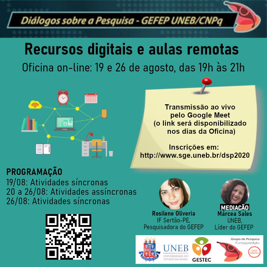GEFEP Inscrição - 14/08/2020 à 19/08/2020Grupo de Pesquisa Forma(em)Ação – GEFEP UNEB CNPq realiza, bienalmente, o evento intitulado Diálogos sobre a Pesquisa. Neste ano (2020), em nossa 5ª edição, provocados pelo contexto internacional motivado pela COVID-19, assumimos como tema: Desterritorializados pela ensino remoto: quais educações são possíveis e necessárias? Em sua primeira edição (2012), o evento reuniu estudantes e pesquisadores para discutirem O Ensino pela Pesquisa, valorizando a participação de estudantes da graduação envolvidos em projetos de pesquisa. Na segunda (2014), debateu a Educação de Jovens e Adultos, contando com a participação de professores e estudantes da graduação, da pós-graduação e da Educação Básica. Na terceira (2016), discutiu Formação Docente após a LDB 9394/96, ampliando a participação de professores e estudantes interessados na temática, numa parceria entre Universidade do Estado da Bahia – UNEB e Faculdade de Educação – FACED UFBA. Na última edição (2018), buscando ampliar esta participação tivemos os Dispositivos Metodológicos de Pesquisa na Pós-graduação como mote das discussões. O evento está vinculado ao Programa de Pós-graduação stricto sensu Gestão e Tecnologias Aplicadas à Educação (GESTEC). Em sua organização, conta com estudantes da graduação e da pós-graduação; além de acolher a participação de atores da escola básica da rede de ensino pública – estadual e municipal -, de Institutos Federais; e de técnicos da UNEB – todos integrantes do GEFEP. O GEFEP tem parceria com os Grupos FEL UNEB/CNPq e FEP UFBA/CNPq; além do Colégio Estadual Roberto Santos (Salvador/BA). Nestes espaços de discussão, as pesquisas realizadas vêm fortalecendo as redes colaborativas de trabalho, na Educação. Com o V Diálogos sobre a Pesquisa, buscamos promover a difusão e a divulgação do conhecimento científico e acadêmico desenvolvido nos diversos espaços educativos, favorecendo o protagonismo nas redes públicas de ensino; e socializar experiências de pesquisa na Educação, tendo como perspectiva a necessária articulação entre Universidade e Educação Básica. Esperamos, assim, ampliar espaços de discussão entre profissionais da Educação em seus distintos segmentos e em todas as modalidades de ensino, tendo como objeto a formação docente no e para o exercício da sua profissão. Neste ano, o V Diálogos sobre a Pesquisa será todo on-line e contará com atividades mensais com inscrições gratuitas: 14 de julho: LIVE Gestão na Educação em Prisões 29 de julho: LIVE Processos de Ensino e Aprendizagem na Educação em Prisões 19 de agosto: OFICINA Recursos Digitais e Aulas Remotas (parte 1) 26 de agosto: OFICINA Recursos Digitais e Aulas Remotas (parte 2) Estas atividades estão disponíveis no canal do Gefep, no YouTube. Acesso o link: https://www.youtube.com/channel/UCDCkUBD_VjR1viDSNX_ekEg Objetivos Promover a divulgação e a difusão do conhecimento científico e acadêmico produzido nos diversos espaços educativos, destacando formação a docente no exercício da profissão e a necessária articulação entre a Universidade e a Educação Básica. Discutir políticas públicas voltadas para a formação docente em exercício, tendo em vista a valorização do magistério; a indução à docência; a gestão na Educação. Debater a valorização do magistério com ênfase na articulação entre Universidade e Educação Básica, visibilizando pesquisas realizadas em Instituições de ensino, na graduação e na pós-graduação. Difundir pesquisas e perspectivas metodológicas desenvolvidas em Programas stricto sensu em Educação que tenham como objeto de estudo a formação em exercício de professores, o currículo, a gestão da educação, a relação ensino e pesquisa e as tecnologias educacionais. Discutir sobre as possibilidades de educar em espaços diversos. Público Alvo Professores e Estudantes de Educação Básica e Superior – Graduação e Pós-graduação – e Institutos Federais. Profissionais e Técnicos da Educação. ISSN 2526-1878 Sejam todos e todas bem vindos e vindas! 19.08 - Atividades síncronas Recursos digitais para aulas remotas (Oficina on-line) Horário: das 19h às 21h. Expositora: Profa. Ms: Rosilene Oliveria - IF Sertão-PE Mediação: Profa. Dra. Márcea Andrade Sales Canal: Google Meet - (o link será disponibilizado nos dias da Oficina) 20 a 26.08 - Atividades assíncronas (Informações em breve) 26.08 - Atividades síncronas Recursos digitais para aulas remotas (Oficina on-line) - Continuação Horário: das 19h às 21h. Expositora: Profa. Ms: Rosilene Oliveria - IF Sertão-PE Mediação: Profa. Dra. Márcea Andrade Sales Canal: Google Meet - (o link será disponibilizado nos dias da Oficina)