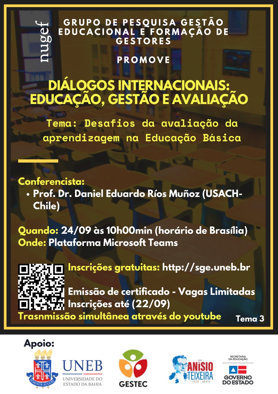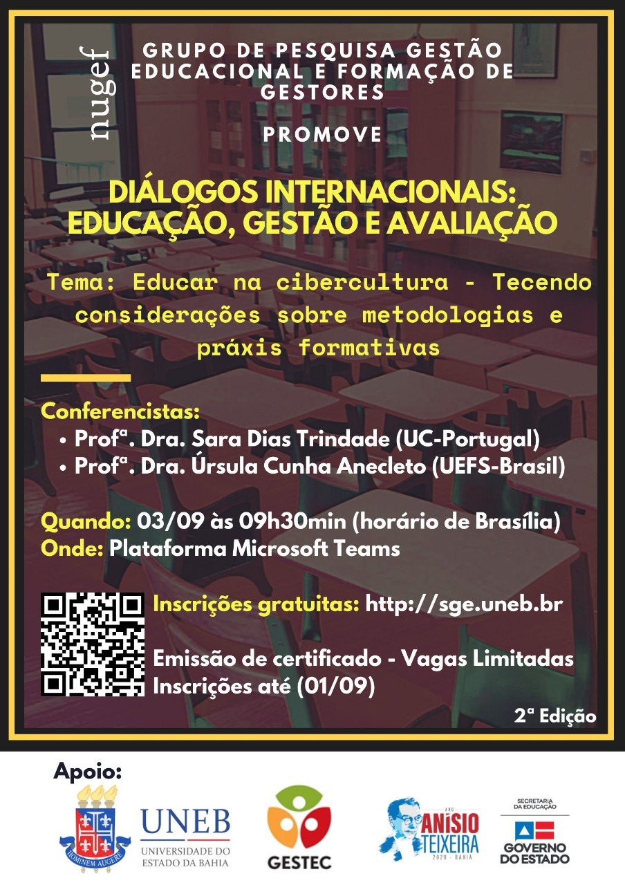 ADM-I Inscrição - 19/08/2020 à 02/09/2020O Grupo de Pesquisa Núcleo de Gestão Educacional e Formação de Gestores (NUGEF) promove o evento DIÁLOGOS INTERNACIONAIS: EDUCAÇÃO, GESTÃO E AVALIAÇÃO. Em continuidade aos Diálogos, será apresentado o tema “Educar na cibercultura - Tecendo considerações sobre metodologias e práxis formativas”, que contará com as conferências da Profª. Drª. Sara Dias Trindade, da Universidade de Coimbra (UC - Portugal) e da Profª. Drª. Úrsula Cunha Anecleto, da Universidade Estadual de Feira de Santana (UEFS - Brasil). A web conferência acontecerá no Microsoft Teams, cujo link para acesso será enviado para o e-mail de cada participante inscrito. Os referidos participantes terão direito a certificação.